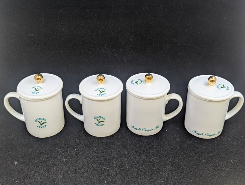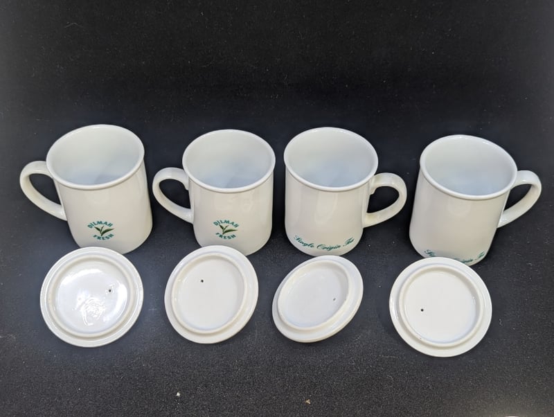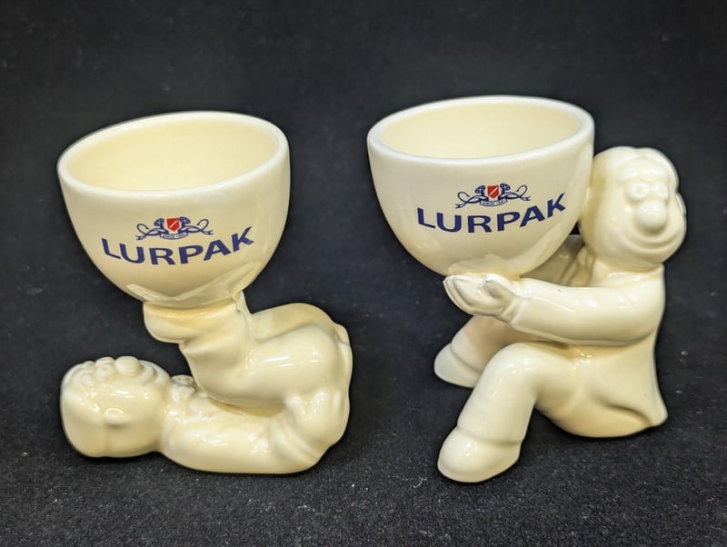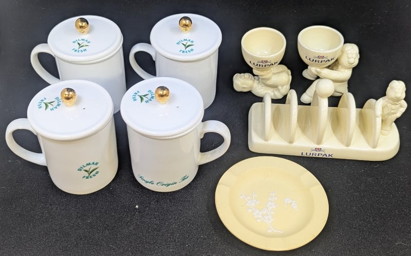 COLLECTION OF TABLEWARE AND DECORATIVE HOMEWARE ITEMS Includes Four 'Dilmah Fresh' Single Origin Tea Cups With Lids, Ceramic Plate With Floral Style Image (Diameter: 12Cm), Lurpack Toast Rack And Two Egg Cups, Lurpack Items Feature Figures Of Man Condition: Good - Refer To Images 584943+6