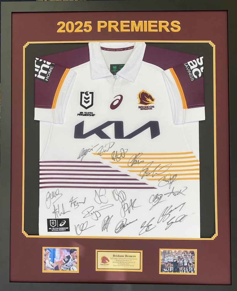 2025 BRISBANE BRONCOS PERSONALLY SIGNED JERSEY (2025 NRL GRAND FINAL CHAMPIONS) Framed Using Double Mats, 2 Unsigned Photographs And A Plaque. Hand Signed By 20 Members Of The 2025 Brisbane Broncos Squad Using A Black Marker Accompanied By A Certificate Of Authenticity Size: 109 X 2 X 89 Condition: Good - Refer To Images 488295+1