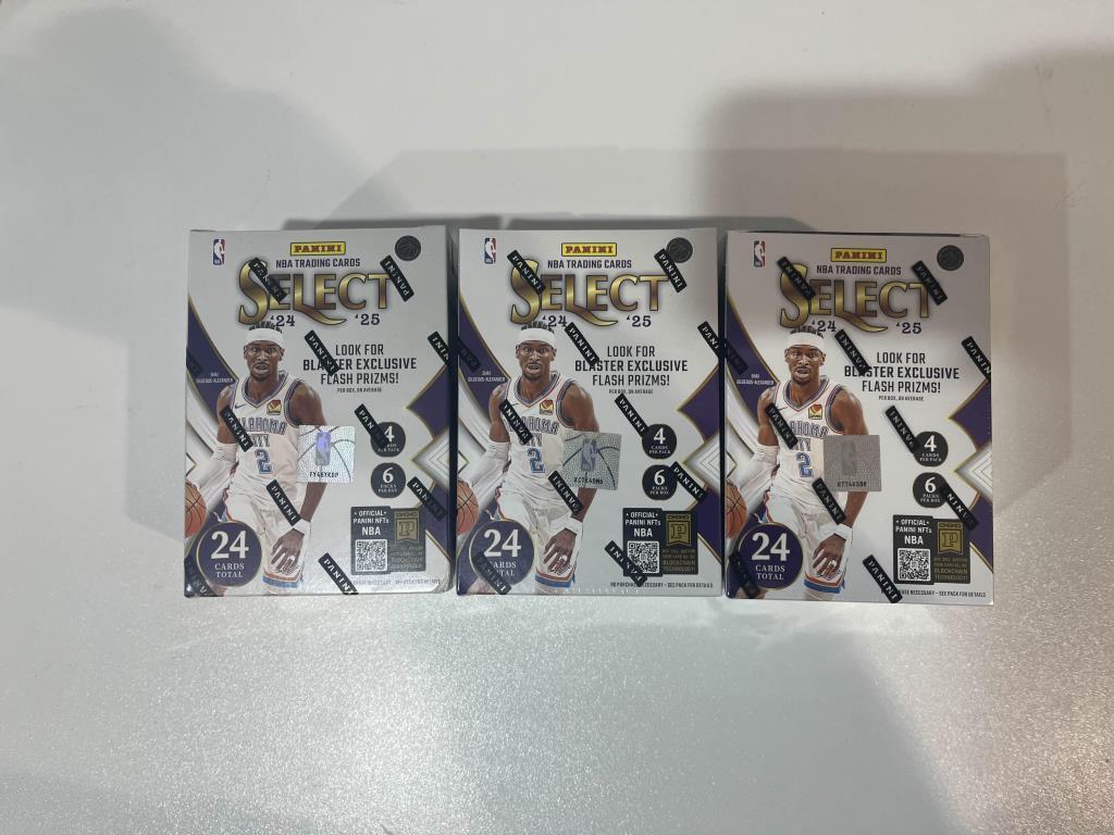 2024-25 PANINI SELECT BASKETBALL 6-PACK BLASTER BOX – BUNDLE OF 3Chase The Thrill Of The Hobby With This Bundle Of Three (3) 2024-25 Panini Select Basketball Blaster Boxes — One Of The Most Anticipated Retail Products Of The Year! Each Box Contains 6 Packs With 4 Cards Per Pack, Offering A Total Of 72 Cards Across The Bundle.Select Is Known For Its Premium Chromium Finish, Multi-Tier Base Set, And Vibrant Range Of Rare Parallels And Inserts. This Year'S Release Continues The Tradition, Featuring Exclusive Blaster-Only Content, Including:Tiger And Elephant Print Prizms – Ultra-Rare Short Prints With Massive Collector DemandRetail-Exclusive Orange Flash Prizms – Bold, Eye-Catching Parallels Found Only In Blaster BoxesRookie Jersey Swatches – Memorabilia Hits Featuring Top 2024 Nba Draft PicksSelect Company, Numbers, And Turbocharged Inserts – Stylish Themed Inserts Showcasing Star PlayersThe Classic Concourse, Premier Level, And Courtside Base Tiers, With Increasingly Rare ParallelsWith A Chance To Pull Rookie Cards Of The 2024 Draft Class, Veteran Autos, And Low-Numbered Prizms, This Bundle Gives Collectors Three Times The Opportunity To Hit Big. Whether You'Re Hunting For The Next Superstar Or Adding Shine To Your Pc, This Select Bundle Delivers Excitement With Every Rip.Perfect For Collectors, Flippers, Or Gifting — Get In Early On The 2024-25 Season With This Triple Threat Of Select Basketball!Condition: Good - Refer To Images488292+33456