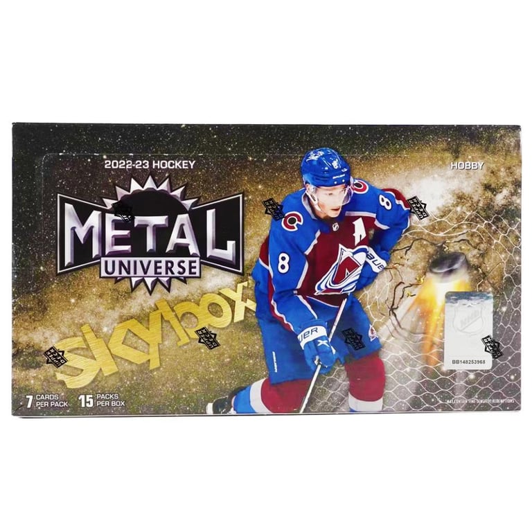 2022-23 UPPER DECK SKYBOX METAL UNIVERSE HOCKEY HOBBY BOXEvery Box Contains Five Aspects/Bottle Rockets/Flash The Glove Cards, Three Skybox Premium Prospects Cards, Three 1998-99 Metal Universe Retros Cards, One The House/Palladium/Hardware,&Nbsp;Petg Card &Amp; One All-Starring/Jarring/Metal Ore Card!Skybox Metal Universe Sports A 200-Card Base Set, Which Breaks Down As Follows:100 Veteran Cards50 Rookie Cards50 Veteran Superstar CardsGrab At Least 1 Rookie And 1 Veteran Superstars Card Per Pack, On Average, And Keep An Eye Out For A Bevy Of Numbered Parallels, Including 1-Of-1 Gold Pmg (Precious Metal Gems) And Autograph Parallels! Additionally, Collect The 1998-99 Metal Universe Retros, A 50-Card Design Variation Featuring The Top Rookies From The Base Set. Each Card In This Collection Sports A Unique Bacround Featuring Original Artwork From The 1998-99 Metal Universe Base Set!15 Packs Per Box, 7 Cards Per PacCondition: Good - Refer To Images488292+33404