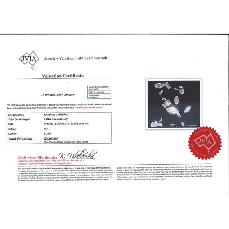 1.08CT TDW X 23, NATURAL DIAMONDS. Marquise/Princess/Baguette Cut, H-J Colour, Si1-P1 Clarity, Loose, Unset. Condition: New. Valuations Provided by an Independent Third-Party Professional Not Directly Associated With Lloyds Auctions at AUD $$2,380.00This valuation has been conducted by an independent third-party professional. The valuation amount is an assessment by the issuing valuer and does not reflect the auction value of the item. Any inquiries regarding the valuation should be directed to the issuing valuer (refer to contact details on the certificate), as Lloyds Auctions has no affiliation or influence over the valuation, the valuer, or the stated amount. Condition: Good - Refer Images 0645846+2238