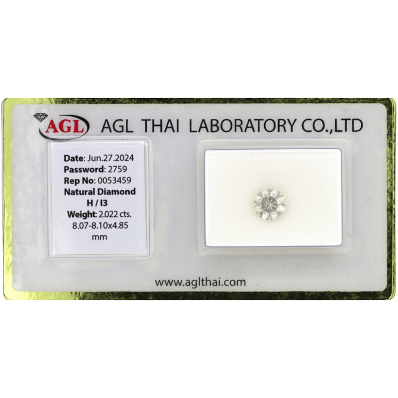 2.022CT CERTIFIED, NATURAL DIAMOND, ROUND BRILLIANT CUT, H COLOUR, I3 CLARITY, LOOSE, UNSET. Stone Comes Sealed With Agl Report: 0053459. Valuations Provided by an Independent Third-Party Professional Not Directly Associated With Lloyds Auctions at AUD $$17,000.00This valuation has been conducted by an independent third-party professional. The valuation amount is an assessment by the issuing valuer and does not reflect the auction value of the item. Any inquiries regarding the valuation should be directed to the issuing valuer (refer to contact details on the certificate), as Lloyds Auctions has no affiliation or influence over the valuation, the valuer, or the stated amount. Condition: Good - Refer Images 0645848+3202