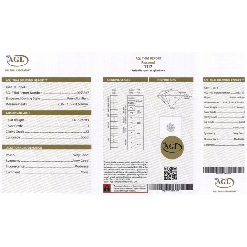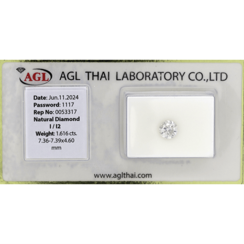 1.616CT CERTIFIED, NATURAL DIAMOND, ROUND BRILLIANT CUT, I COLOUR, I2 CLARITY, LOOSE, UNSET. Stone Comes Sealed With Agl Report: 0053317. Valuations Provided by an Independent Third-Party Professional Not Directly Associated With Lloyds Auctions at AUD $$16,000.00This valuation has been conducted by an independent third-party professional. The valuation amount is an assessment by the issuing valuer and does not reflect the auction value of the item. Any inquiries regarding the valuation should be directed to the issuing valuer (refer to contact details on the certificate), as Lloyds Auctions has no affiliation or influence over the valuation, the valuer, or the stated amount. Condition: Good - Refer Images 0645848+3218