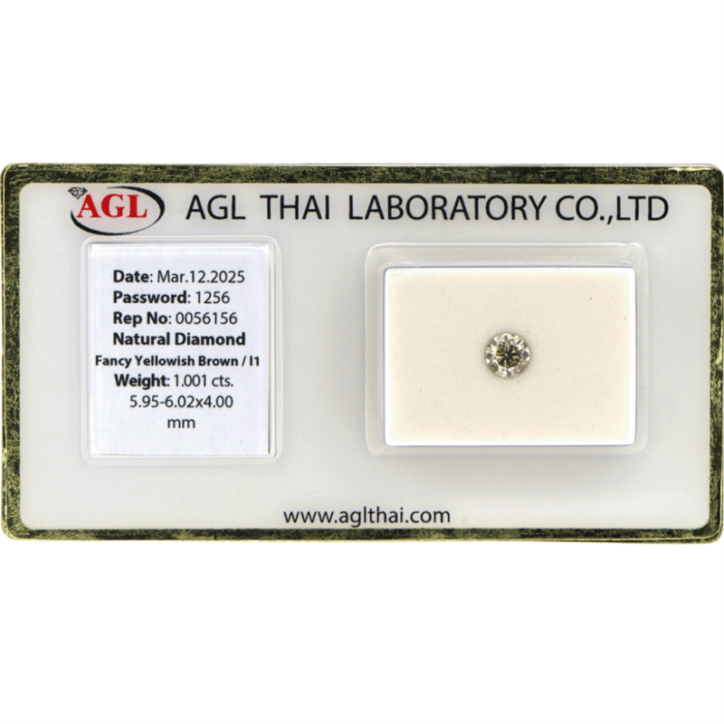 1.001CT CERTIFIED, NATURAL FANCY YELLOW DIAMOND, ROUND BRILLIANT CUT, FANCY YELLOWISH-BROWN, I1 CLARITY, LOOSE, UNSET. Stone Comes Sealed With Agl Report: 0056156. Valuations Provided by an Independent Third-Party Professional Not Directly Associated With Lloyds Auctions at AUD $$20,000.00This valuation has been conducted by an independent third-party professional. The valuation amount is an assessment by the issuing valuer and does not reflect the auction value of the item. Any inquiries regarding the valuation should be directed to the issuing valuer (refer to contact details on the certificate), as Lloyds Auctions has no affiliation or influence over the valuation, the valuer, or the stated amount. Condition: Good - Refer Images 0645848+3224