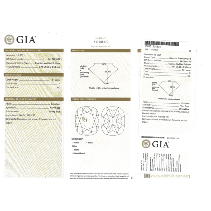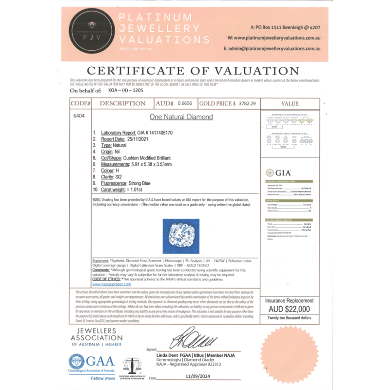 1.01CT CERTIFIED, NATURAL DIAMOND, CUSHION MODIFIED BRILLIANT CUT, H COLOUR, SI2 CLARITY, LOOSE, UNSET. Stone Comes With Gia Report: 1417405170. Valuations Provided by an Independent Third-Party Professional Not Directly Associated With Lloyds Auctions at AUD $$22,000.00This valuation has been conducted by an independent third-party professional. The valuation amount is an assessment by the issuing valuer and does not reflect the auction value of the item. Any inquiries regarding the valuation should be directed to the issuing valuer (refer to contact details on the certificate), as Lloyds Auctions has no affiliation or influence over the valuation, the valuer, or the stated amount. Condition: Good - Refer Images 0645848+3283