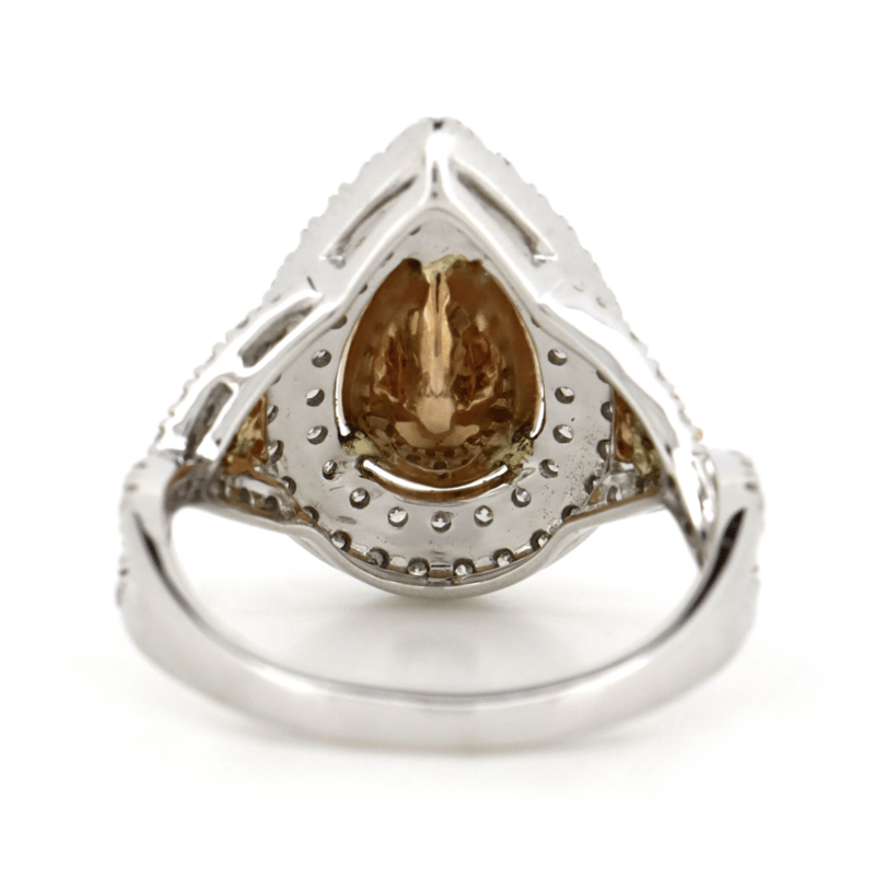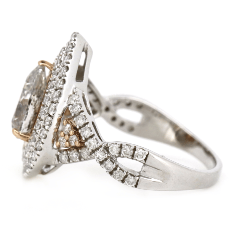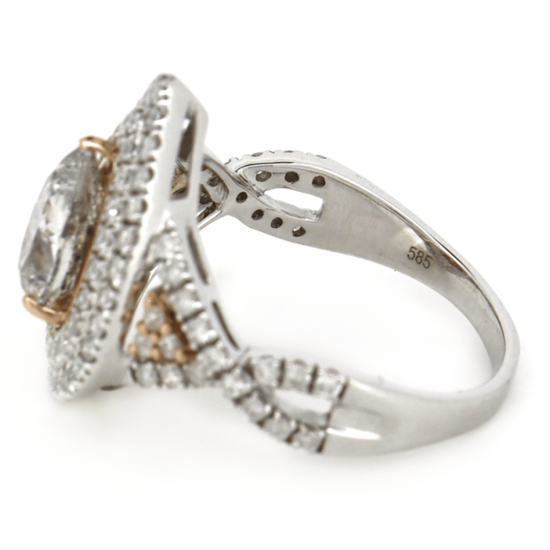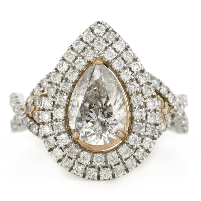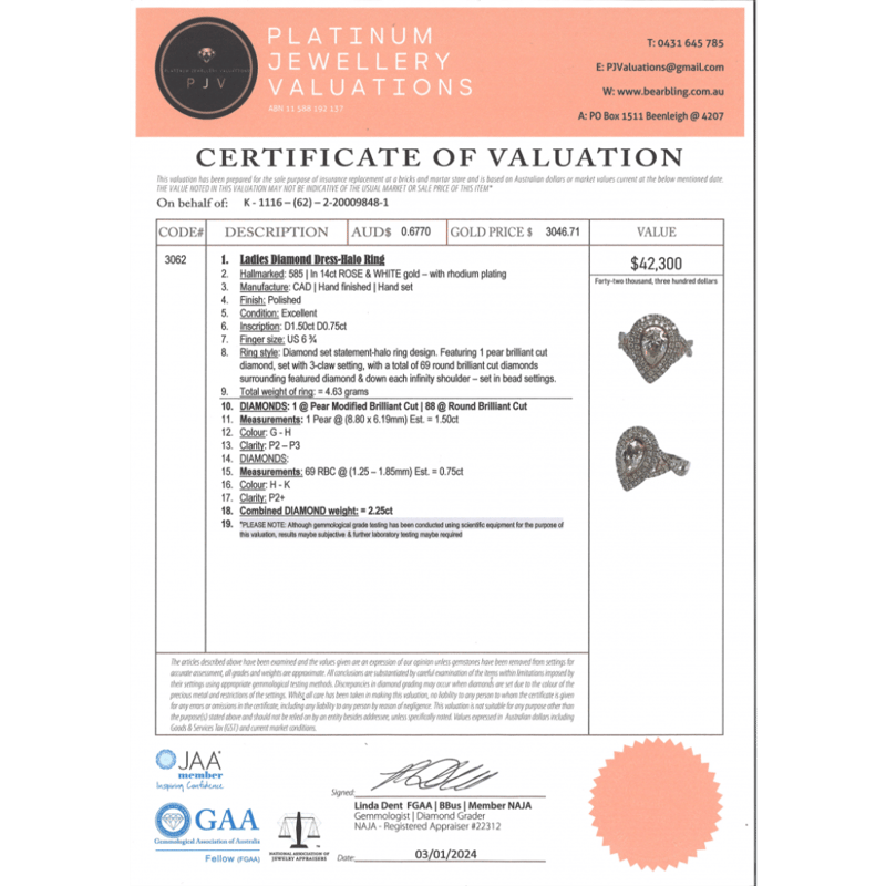 14K WHITE/ROSE GOLD AND DIAMOND, DOUBLE HALO TWIST BAND RING. The Centre Features, One Pear Modified Brilliant Cut, Diamond (1.50Ct, G-H Colour, P2-P3 Clarity), 3 Claw Set. Surrounding The Centre In A Halo Are, 69 Round Brilliant Cut, Diamonds (0.75Ct Tdw, H-K Colour, P2+ Clarity), Bead Set. Ring Size M 1/2. Valuations Provided by an Independent Third-Party Professional Not Directly Associated With Lloyds Auctions at AUD $$42,300.00This valuation has been conducted by an independent third-party professional. The valuation amount is an assessment by the issuing valuer and does not reflect the auction value of the item. Any inquiries regarding the valuation should be directed to the issuing valuer (refer to contact details on the certificate), as Lloyds Auctions has no affiliation or influence over the valuation, the valuer, or the stated amount. Condition: Good - Refer Images 0645848+3241