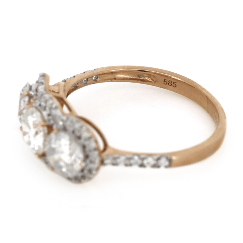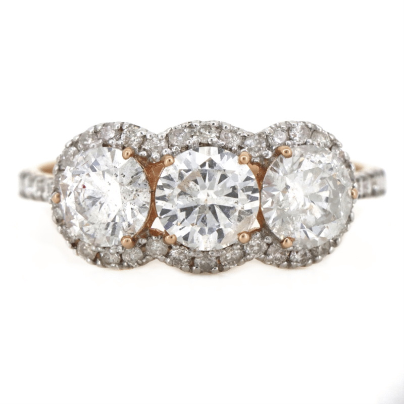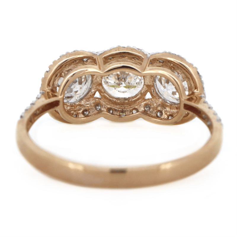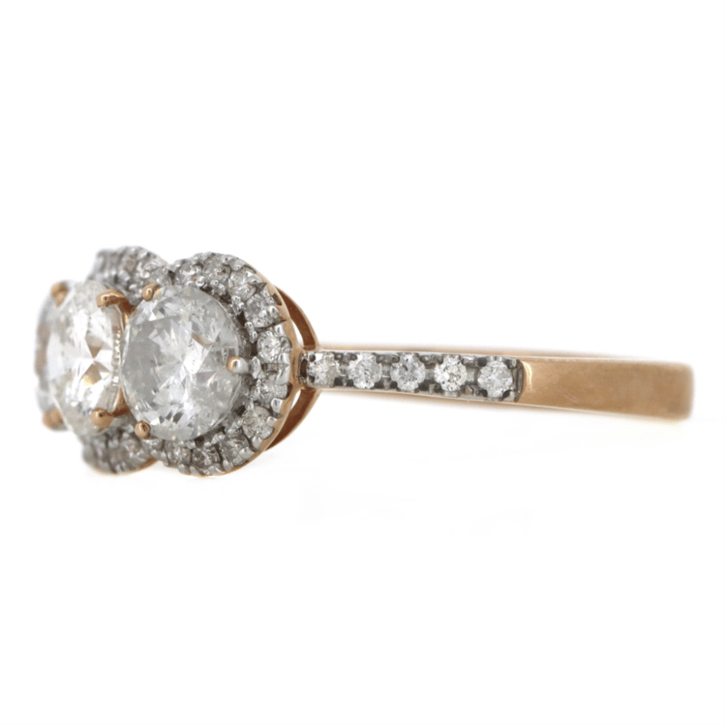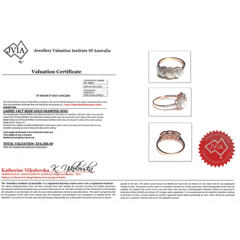 14K ROSE GOLD AND DIAMOND, HALO TRILOGY RING. The Centre Features, 3 Round Brilliant Cut, Diamonds (1.65Ct Tdw, H-I Colour, P1-P2 Clarity), Claw Set. Surrounding The Central Design In A Halo And Decorating The Band Are, 40 Round Brilliant Cut, Diamonds (0.36Ct Tdw, H-J Colour, Si2-P2 Clarity), Claw Set. Ring Size N. Valuations Provided by an Independent Third-Party Professional Not Directly Associated With Lloyds Auctions at AUD $$34,280.00This valuation has been conducted by an independent third-party professional. The valuation amount is an assessment by the issuing valuer and does not reflect the auction value of the item. Any inquiries regarding the valuation should be directed to the issuing valuer (refer to contact details on the certificate), as Lloyds Auctions has no affiliation or influence over the valuation, the valuer, or the stated amount. Condition: Good - Refer Images 0645848+3291