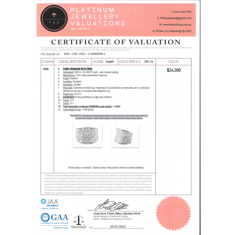 14K WHITE GOLD, 2.88CT TDW DIAMOND, CLUSTER RING. The Design Features, 83 Round Brilliant Cut, Diamonds (2.88Ct Tdw, H-K Colour, P1+ Clarity), Multi-Bead Set. Ring Size Q. Valuations Provided by an Independent Third-Party Professional Not Directly Associated With Lloyds Auctions at AUD $$24,300.00This valuation has been conducted by an independent third-party professional. The valuation amount is an assessment by the issuing valuer and does not reflect the auction value of the item. Any inquiries regarding the valuation should be directed to the issuing valuer (refer to contact details on the certificate), as Lloyds Auctions has no affiliation or influence over the valuation, the valuer, or the stated amount. Condition: Good - Refer Images 0645848+3288