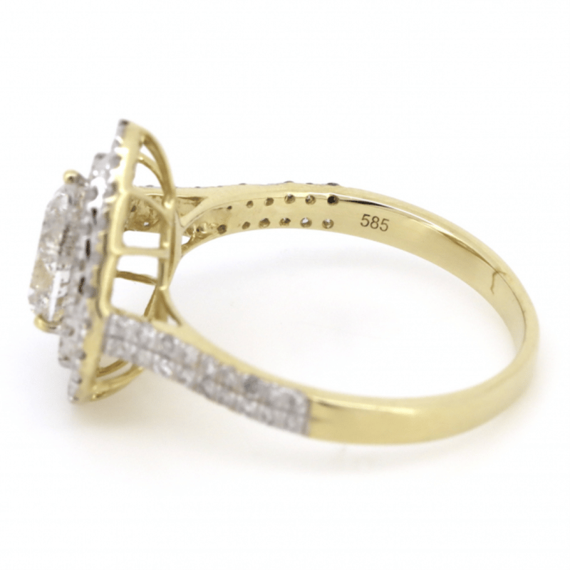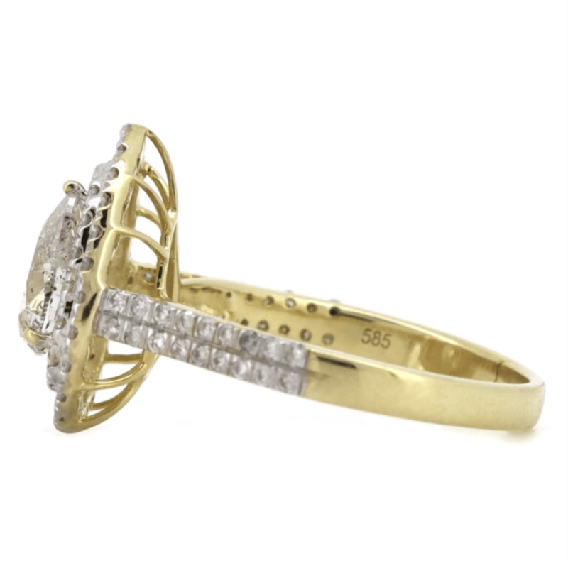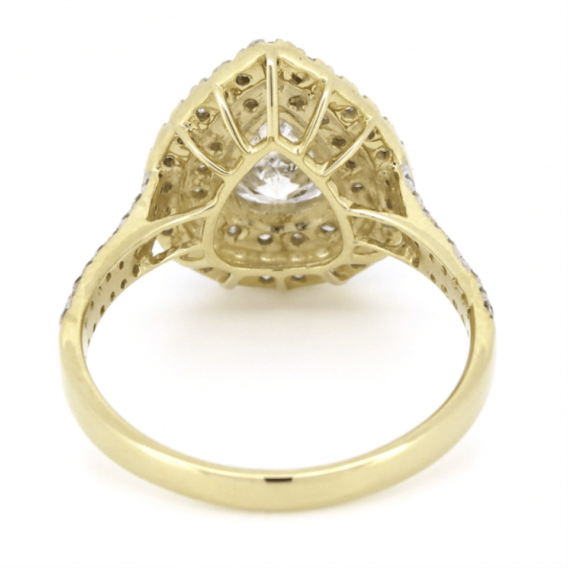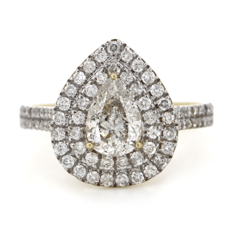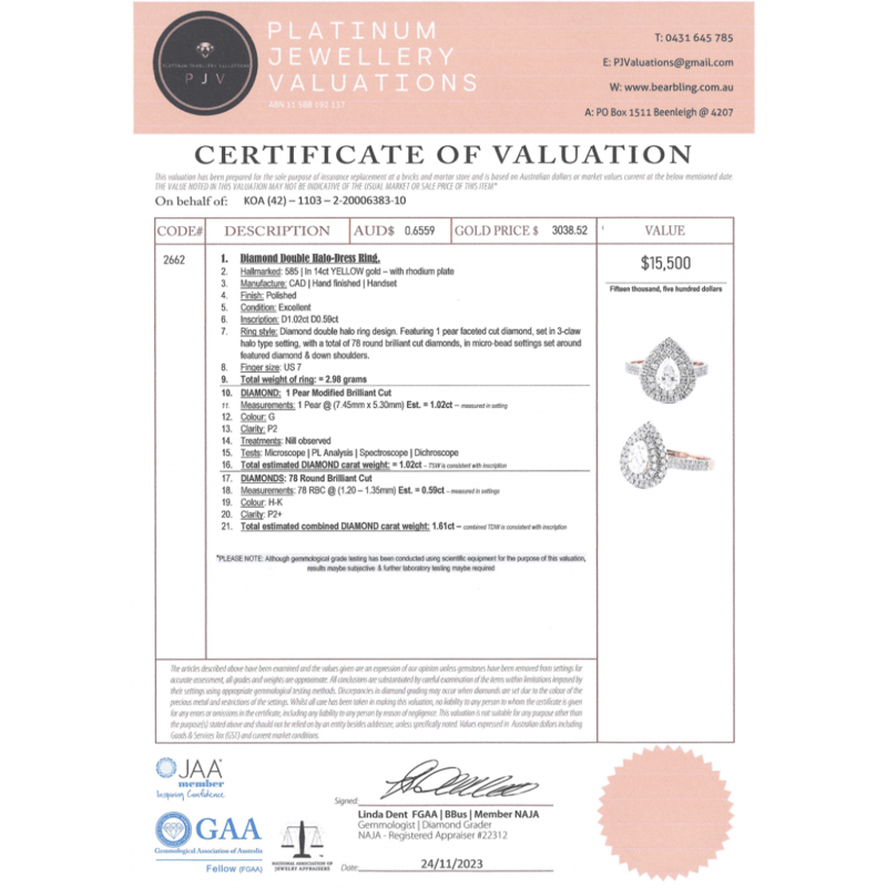 14K YELLOW GOLD AND DIAMOND, DOUBLE HALO RING. The Centre Features, One Pear Brilliant Cut, Diamond (1.02Ct, G Colour, P2 Clarity), Claw Set. Surrounding The Centre In A Double Halo And Decorating The Band Are, 78 Round Brilliant Cut, Diamonds (0.59Ct Tdw, H-K Colour, P2+ Clarity), Micro-Bead Set. Ring Size N. Valuations Provided by an Independent Third-Party Professional Not Directly Associated With Lloyds Auctions at AUD $$15,500.00This valuation has been conducted by an independent third-party professional. The valuation amount is an assessment by the issuing valuer and does not reflect the auction value of the item. Any inquiries regarding the valuation should be directed to the issuing valuer (refer to contact details on the certificate), as Lloyds Auctions has no affiliation or influence over the valuation, the valuer, or the stated amount. Condition: Good - Refer Images 0645848+3259
