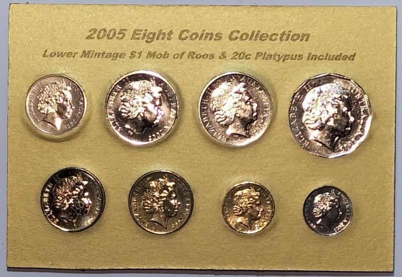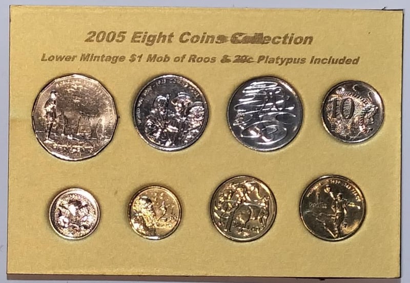 2005 EIGHT COINS COLLECTION LOWER MINTAGE $1 MOB OF ROOS & 20C PLATYPUS INCLUDED Condition: UNCEx Mint Roll23528+6