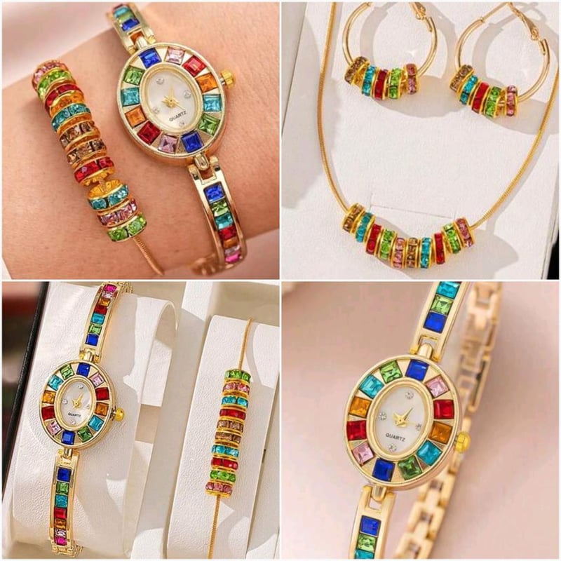 4 X PIECES MULTICOLOR CUBIC ZIRCONIA AND STAINLESS STEEL WATCH BRACELET NECKLACE AND EARRINGS SET Condition: Good - Refer to Images 0162945+25FC