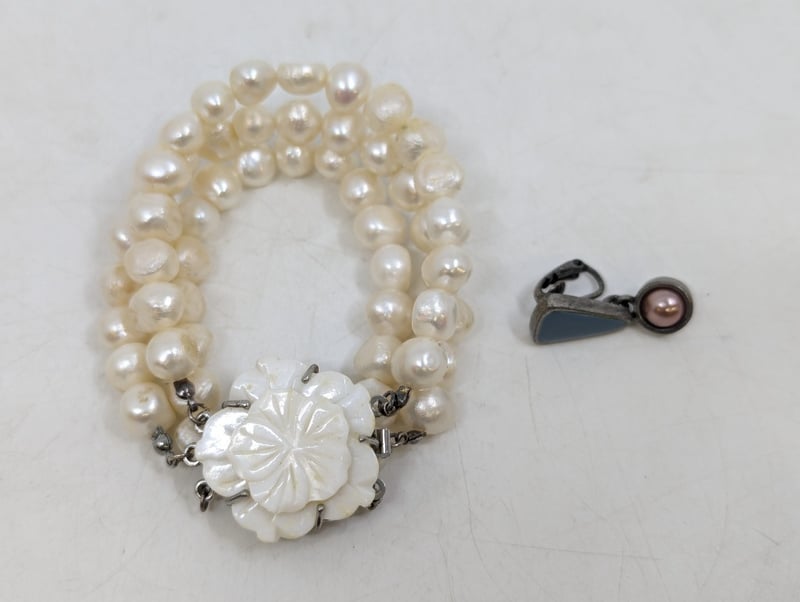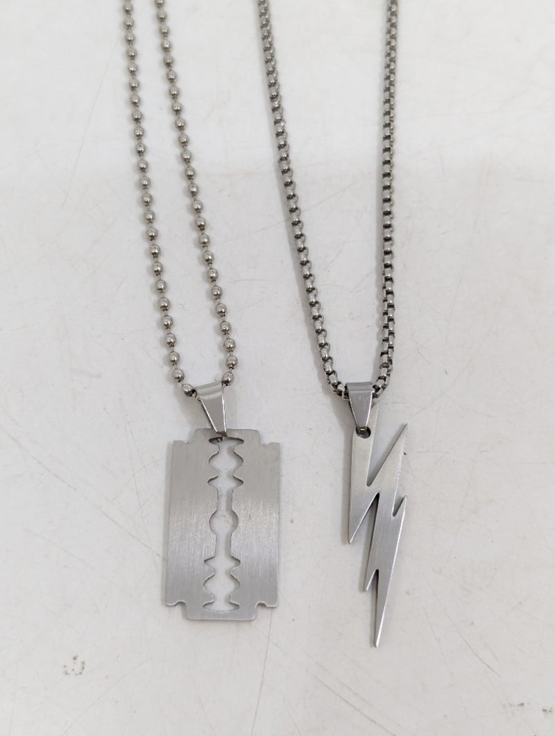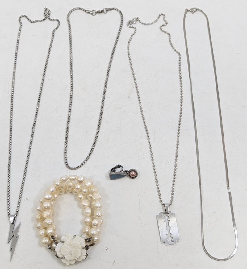 COLLECTION OF JEWELLERY PIECES INCLUDING CHAINS WITH PENDANT, BRACELET AN CLIP ON EARRING Includes Faux Pearl Bracelet With Floral Design, Four Necklace, Two Necklaces Features Pendants With Razor Blade And Lightning Theme 237395+29