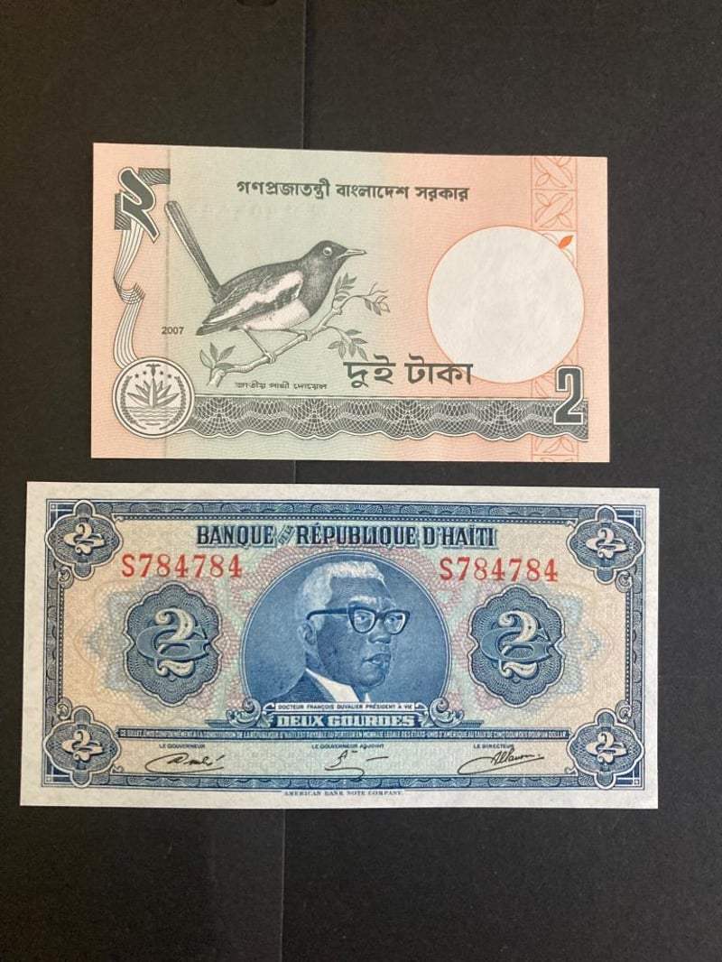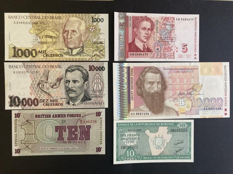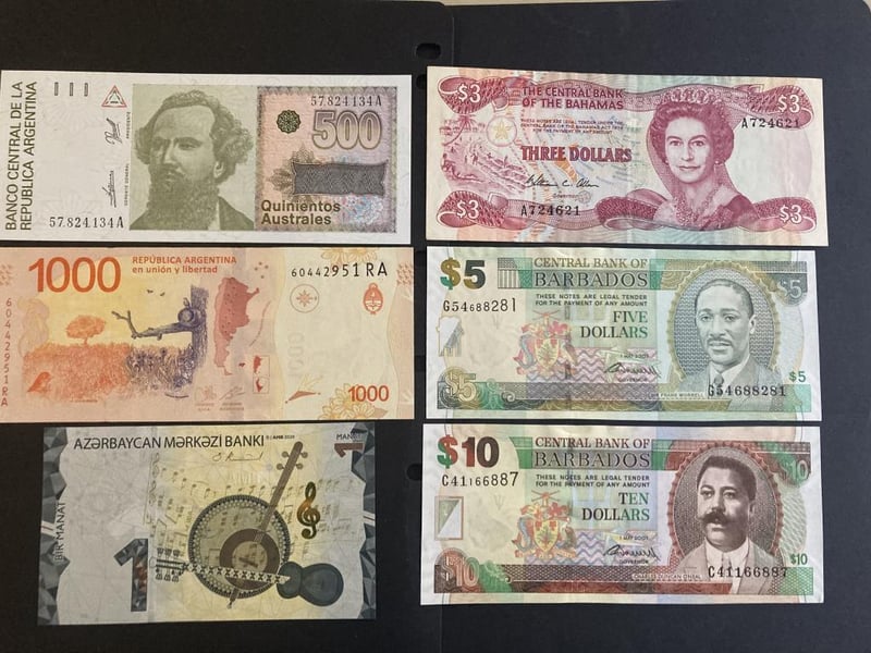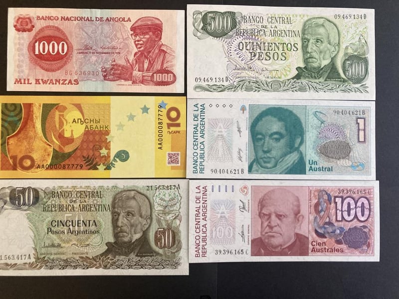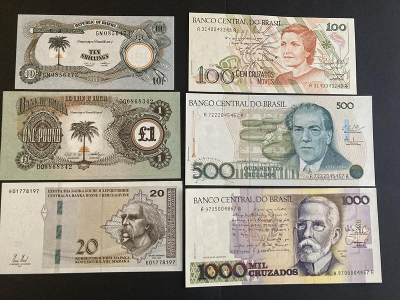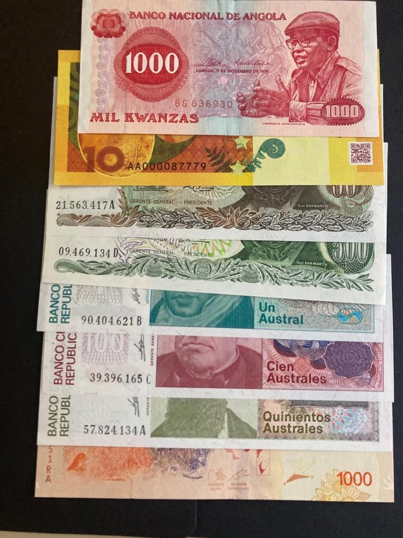 LOT OF 26 WORLD NOTES FROM ANGOLA, ABKHAZIA, ARGENTINA, AZERBAIJAN, BAHAMAS, BARBADOS, BIAFRA, BOSNIA & HERZEGOVINA, BRASIL, BRITISH ARMED FORCES, BULGARIA, BURUNDI, HAITI AND UKRAINE (ALL UNCIRCULATED) Condition: Unc488248+5