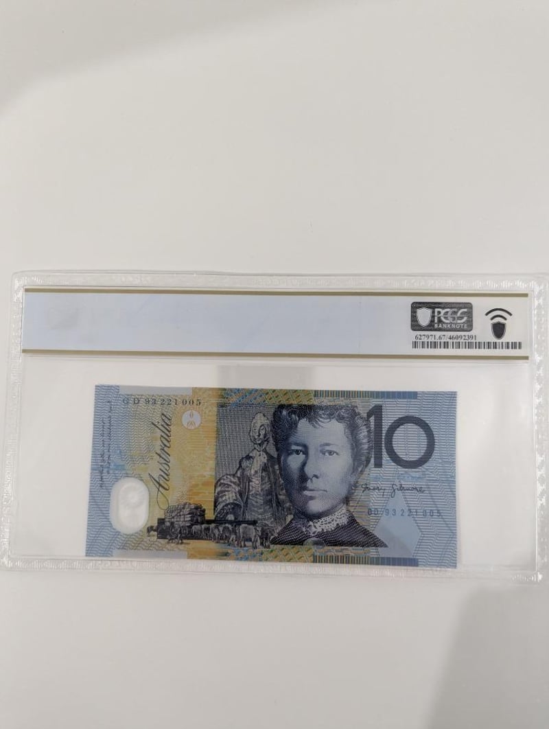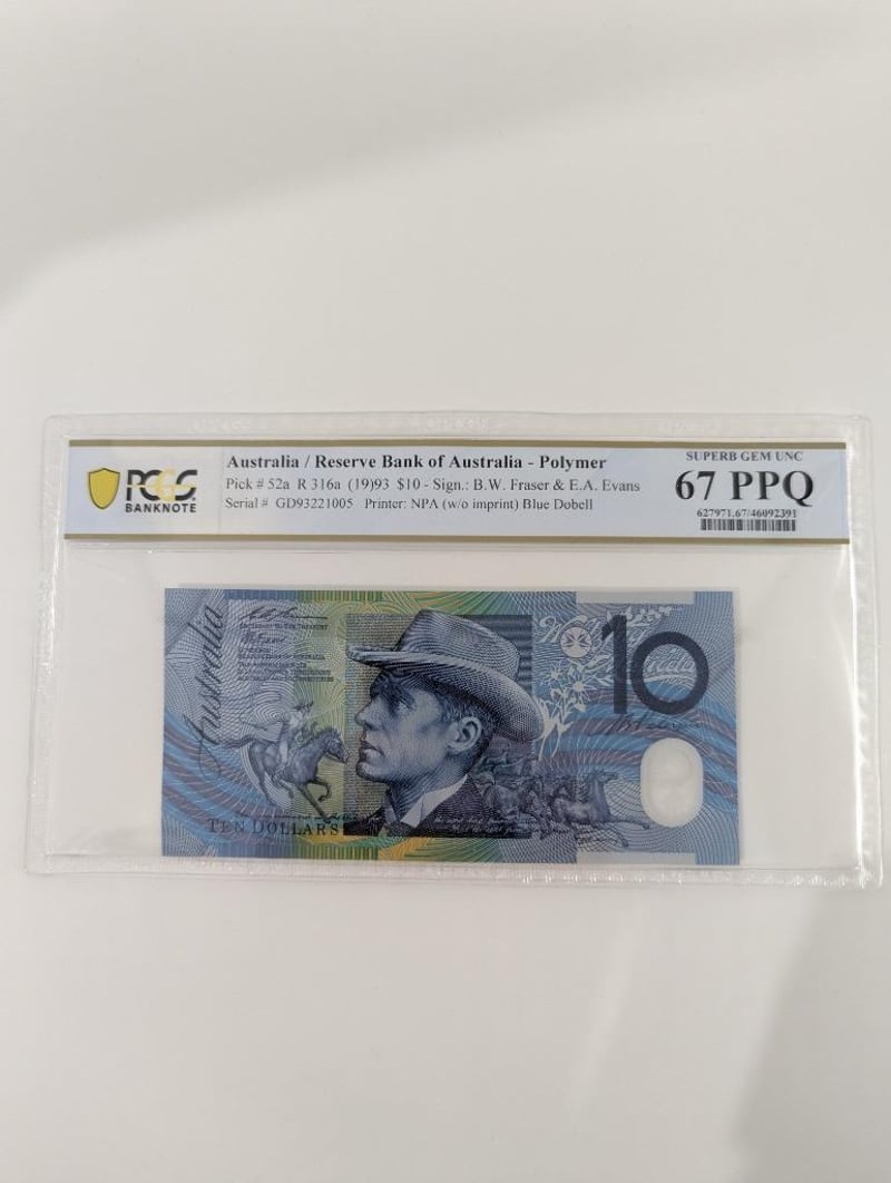 AUSTRALIAN 1993 PCGS GRADED 67 PPQ W/O IMPRINT BLUE DOBELL $10 NOTE SIGNED BY FRASER-EVANS. Condition: UNC-GEM587622+25