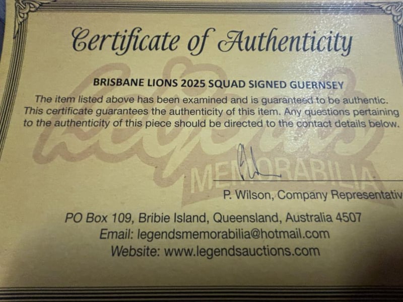BRISBANE LIONS 2025 SQUAD SIGNED & FRAMED GUERNSEY Brisbane Lions 2025 Squad Signed Guernsey. The Guernsey Has Been Framed Measuring 600M Wide X 800M High. A Gold Plaque Stating 'Brisbane Lions 2025'. The Consecutive Afl Champions For 2024/25. The Item Is Accompanied By A Certificate Of Authenticity. +18