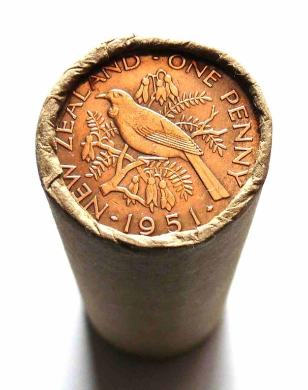 ROLL OF 1951 KGVI, NEW ZEALAND PENNY (50X CIRCULATED COINS IN A ROLL). 488296+14
