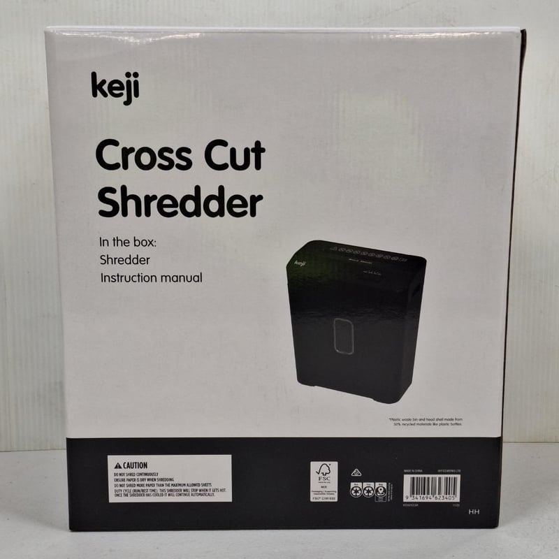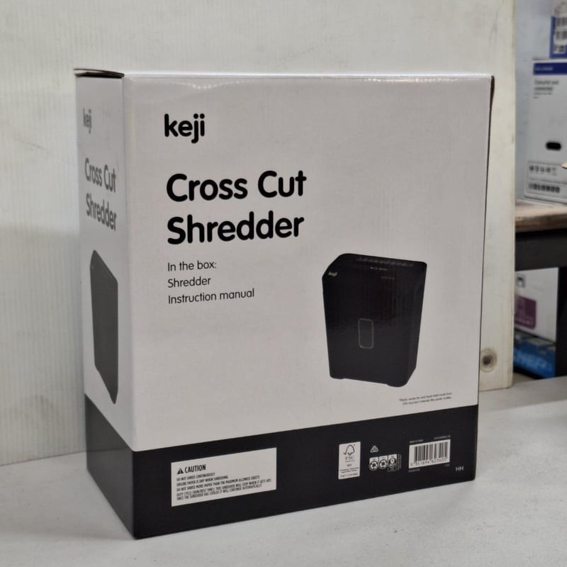 RRP $65.00 KE6SHCCSR, Keji Cross Cut Shredder This Keji Cross Cut Shredder is perfect for destroying sensitive, private, and confidential documents efficiently. It has a lift-off bin with an 12L capacity and can shred 6 sheets at one time. It has a reverse function to clear jams and 220mm entry width to ensure efficient cutting.