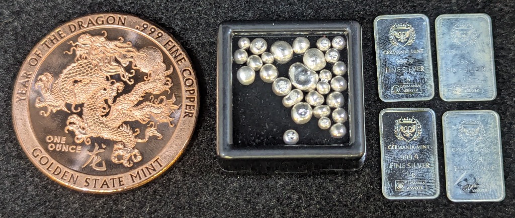 COLLECTION OF SILVER AND 1OZ COPPER COINIncludes Approx 5G Silver Scrap, Four 1G Germania Mint 999.9 Fine Silver Bars, 1Oz Golden State Mint Year Of The Dragon Fine Copper Coin584937+56