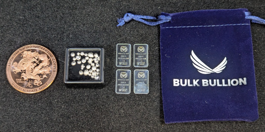 COLLECTION OF SILVER AND 1OZ COPPER COINIncludes Approx 4.8G Silver Scrap, Four 1G Germania Mint 999.9 Fine Silver Bars, 1Oz Golden State Mint Year Of The Dragon Fine Copper Coin584937+59