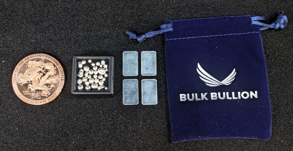 COLLECTION OF SILVER AND 1OZ COPPER COINIncludes Approx 5.7G Silver Scrap, Four 1G Germania Mint 999.9 Fine Silver Bars, 1Oz Golden State Mint Year Of The Dragon Fine Copper Coin584937+62