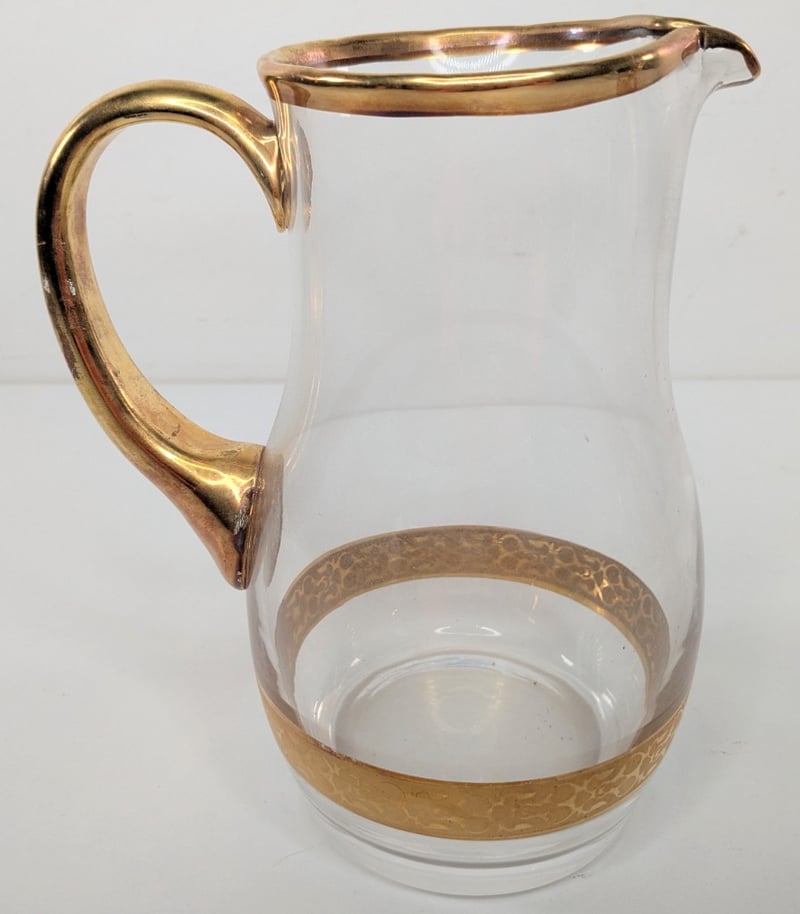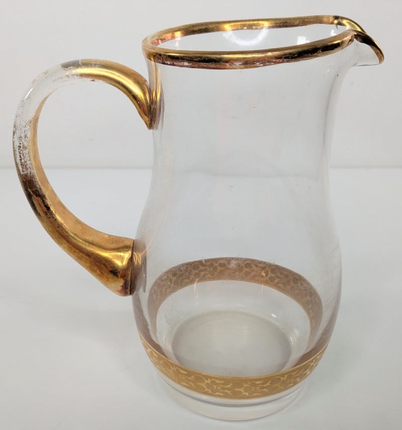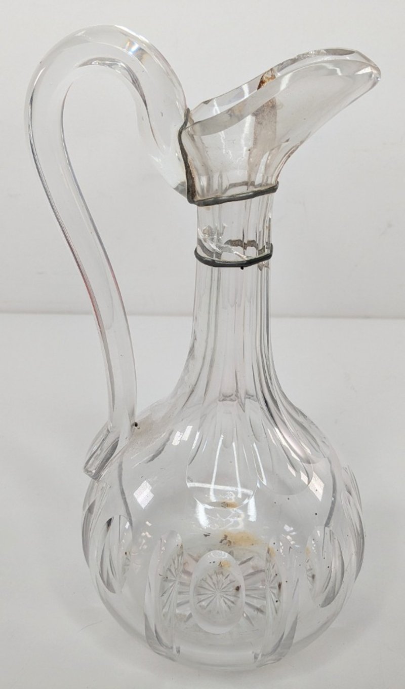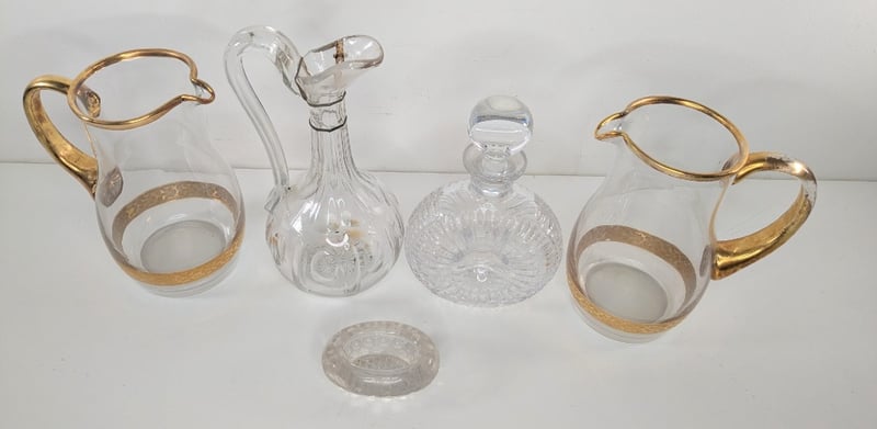 Two Glass Jugs With Gold Trim, Crystal Wine Cruet, Crystal Decanter, Crystral Salt Cellars