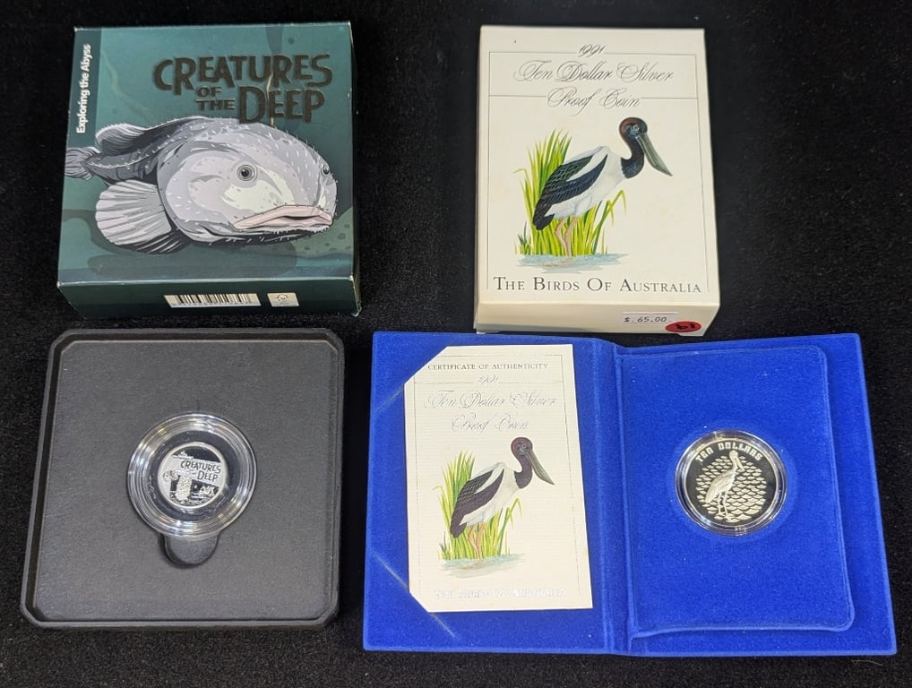 2023 CREATURES OF THE DEEP SILVER PROOF COIN AND 1991 BIRDS OF AUSTRALIA TEN DOLLAR SILVER PROOF COIN Condition: Proof 584942+4