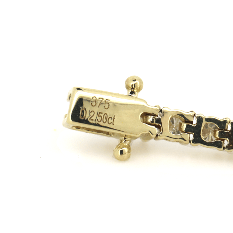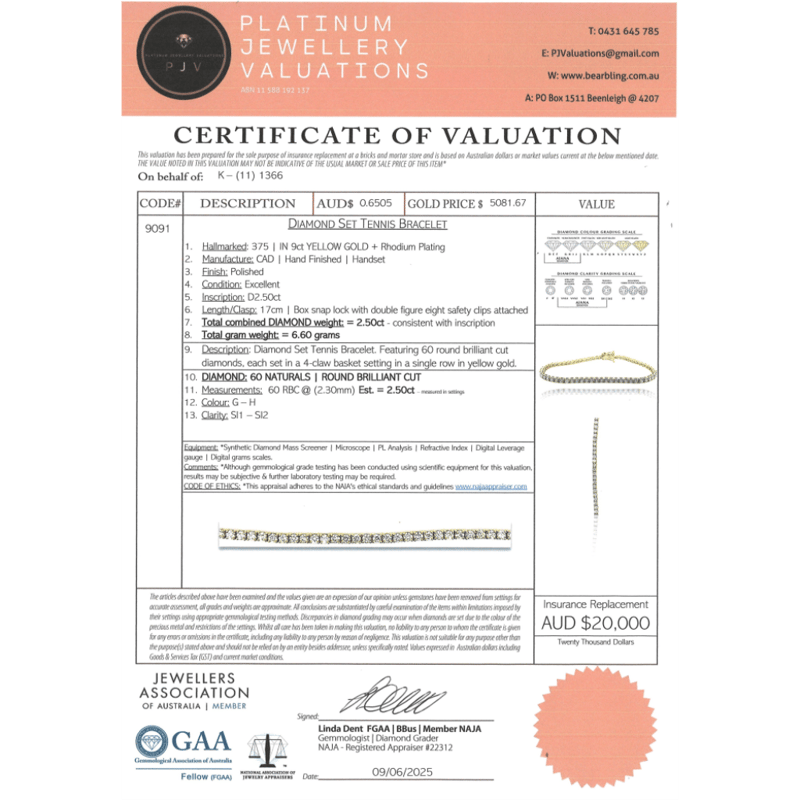 9K YELLOW GOLD AND 2.50CT TDW DIAMOND, TENNIS BRACELET. The Design Features, 60 Round Brilliant Cut, Diamonds (2.50Ct Tdw, G-H Colour, Si1-Si2 Clarity), 4 Claw Set In A Single Row. The Bracelet Has A Box Lock With 2 'Figure 8' Safety Catches. Bracelet Length Is 17.0Cm. Valuations Provided by an Independent Third-Party Professional Not Directly Associated With Lloyds Auctions at AUD $$20,000.00This valuation has been conducted by an independent third-party professional. The valuation amount is an assessment by the issuing valuer and does not reflect the auction value of the item. Any inquiries regarding the valuation should be directed to the issuing valuer (refer to contact details on the certificate), as Lloyds Auctions has no affiliation or influence over the valuation, the valuer, or the stated amount. Condition: Good - Refer Images 0645847+4