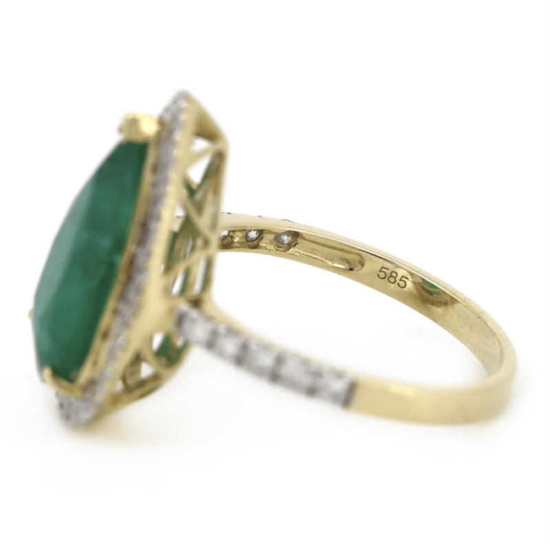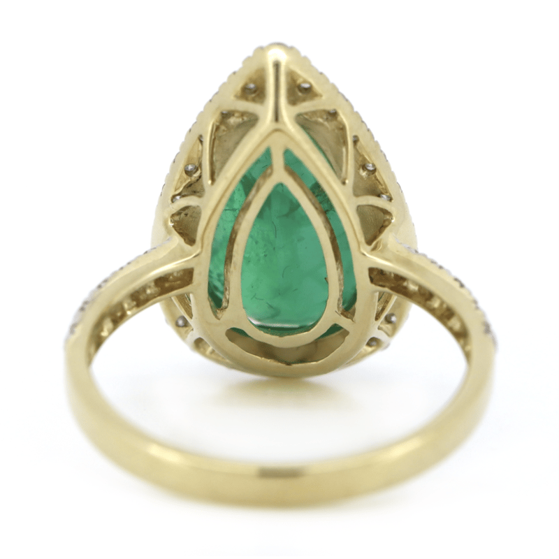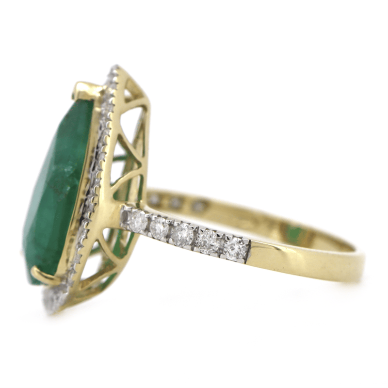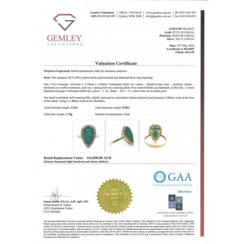14K YELLOW/WHITE GOLD, EMERALD AND DIAMOND, HALO RING. The Centre Features, One Pear Cut, Medium Bluish-Green, Emerald (3.52Ct, Moderate Eye Visible Inclusions), Claw Set In Yellow Gold. Encompassing The Centre Are, 35 Round Brilliant Cut, Diamonds (0.50Ct Tdw, J-K Colour, Si2-I1 Clarity), Micro-Claw Set In White Gold. Ring Size M 1/2. Valuations Provided by an Independent Third-Party Professional Not Directly Associated With Lloyds Auctions at AUD $$16,890.00This valuation has been conducted by an independent third-party professional. The valuation amount is an assessment by the issuing valuer and does not reflect the auction value of the item. Any inquiries regarding the valuation should be directed to the issuing valuer (refer to contact details on the certificate), as Lloyds Auctions has no affiliation or influence over the valuation, the valuer, or the stated amount. Condition: Good - Refer Images 0645847+44