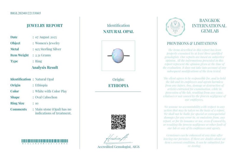 NATURAL OPAL RING ON 925 SILVER - WITH DIGITAL CERTIFICATE ONLY Gemstone : Natural OpalCertificate (Digital): Bigl20240122133065Item Total Weight : 2.31 GramsMain Stone Color : White With Color PlaySize : 10Comments : Main Stone (Opal) Has No Indications Of Treatment.✻ Verify Report Online At Www.Bangkokinternationalgemlab.Co Condition: Good - Refer Images 01611137+40