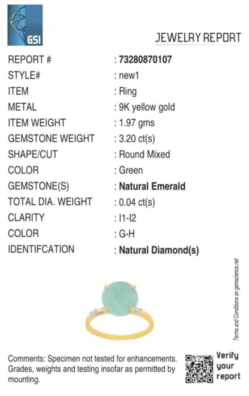 9CT YELLOW GOLD NATURAL EMERALD & DIAMOND RING Weight Of The Item: 1.97 GFineness Of Metal(S): Yellow Gold 9KtThe Ring Consists Of (1) Round Brilliant Natural Emerald. Surrounding The Main Stones Are Round Brilliant Cut Natural Diamonds.Identification: Natural EmeraldColor: GreenShape: Round Brilliant CutNo. Of Stone: 1Dimension: 10 Mm X 10 Mm X 6 MmWeight: 3.2 CaratsCut: Very GoodIdentification: Natural DiamondShape: Round Brilliant CutWeight: 0.04 CtsCut: Excellent.Certificates Are Provided By Gemological Science International (Gsi), An Independent Third-Party Gemological Laboratory Based In The Usa And Recognised Among The Top 10 Gem Labs Globally Markings: 9ct Condition: Good - Refer Images 0488218+2