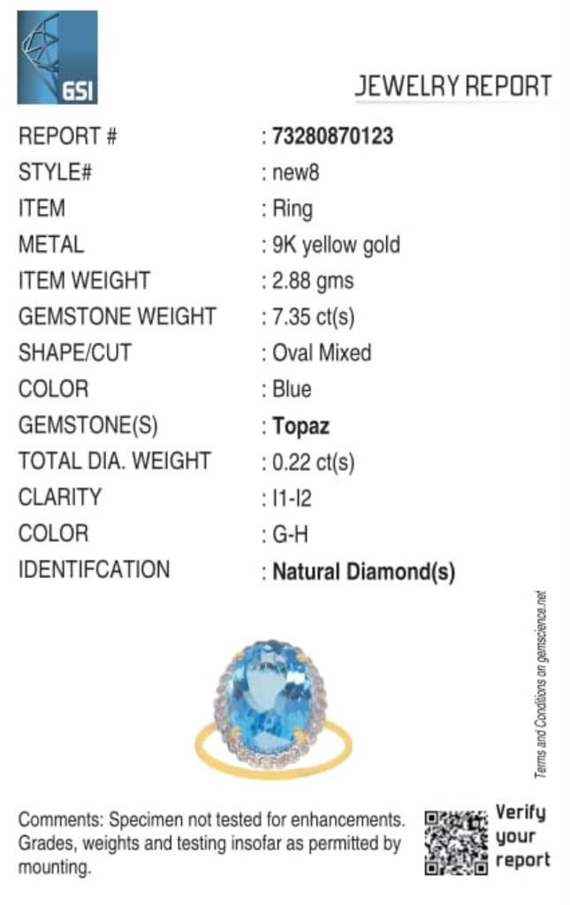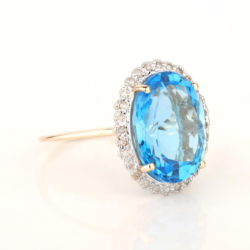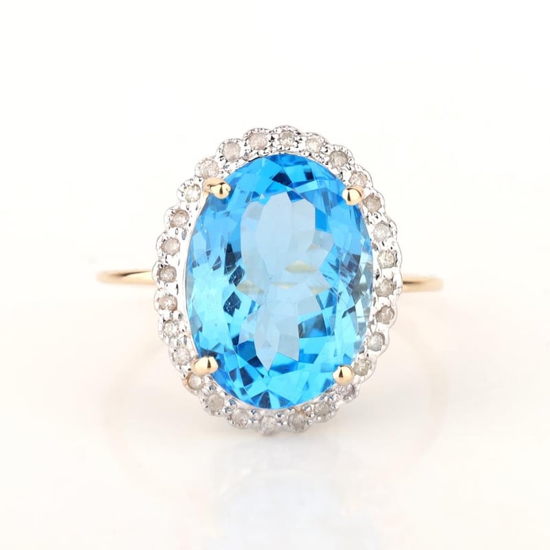 The Ring Consists Of (1) Oval Brilliant Natural Swiss Blue Topaz. Surrounding The Main Stones Are Round Brilliant Cut Natural Diamonds.