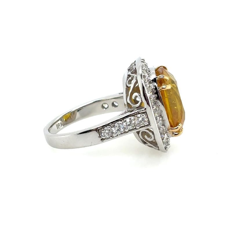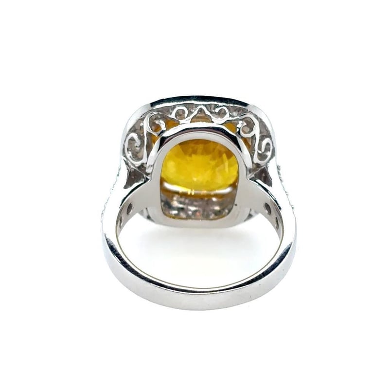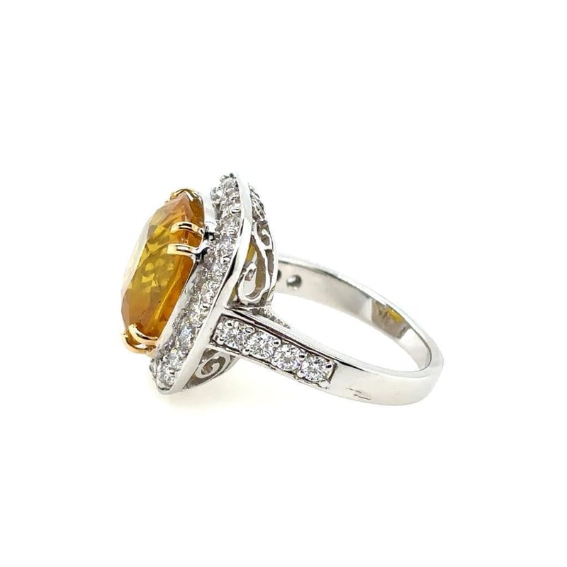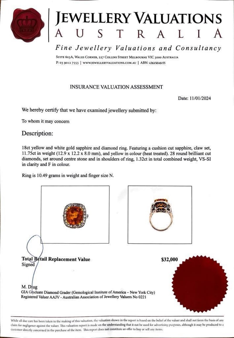 18CT YELLOW AND WHITE GOLD SAPPHIRE AND DIAMOND RING Total Item Weight: 10.49gms This 18Ct White Gold Ring Features 1 X 11.75Ct Cushion Cut Claw Set Sapphire, Measuring 12.9Mm X 12.2Mm X 8Mm And Heat Treated Yellow In Colour With 28 X Round Brilliant Cut Diamonds Set Around The Centre Stone And Down The Shoulders Of The Ring, 1.32Ct In Total Combined Weight, Vs-Si In Clarity And F In Colour. Jewellery Valuations Provided By A Third Party Professional Not Directly Associated With Lloyds Auctions at AUD $32000This Insurance Valuation has been provided by a registered Jewellery Valuer and is intended for insurance purposes only. The valuation amount has no bearing on the auction value of the item. Any questions regarding the valuation should be directed to the issuing Valuer (refer to contact details on the certificate) as Lloyds have no association or relationship with the Valuer or the valuation amount contained within the valuation. Condition: Excellent- Refer Images 0162901+169CROSSDOCK
