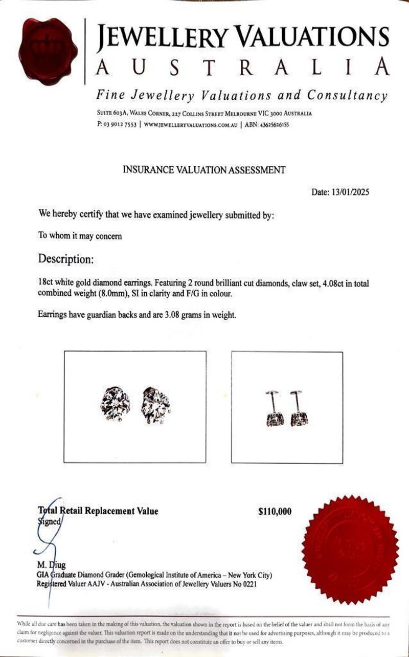18K WHITE GOLD DIAMOND STUD EARRINGS Total Item Weight: 3.08gms These Earrings Feature 2 Claw Set Round Brilliant Cut Diamonds, Si In Clarity And F/G In Colour Weighing 4.08Ct In Total Carat WeightEarrings Have Guardian Backs Jewellery Valuations Provided By A Third Party Professional Not Directly Associated With Lloyds Auctions at AUD $110000This Insurance Valuation has been provided by a registered Jewellery Valuer and is intended for insurance purposes only. The valuation amount has no bearing on the auction value of the item. Any questions regarding the valuation should be directed to the issuing Valuer (refer to contact details on the certificate) as Lloyds have no association or relationship with the Valuer or the valuation amount contained within the valuation. Condition: Excellent- Refer Images 0162901+201CROSSDOCK