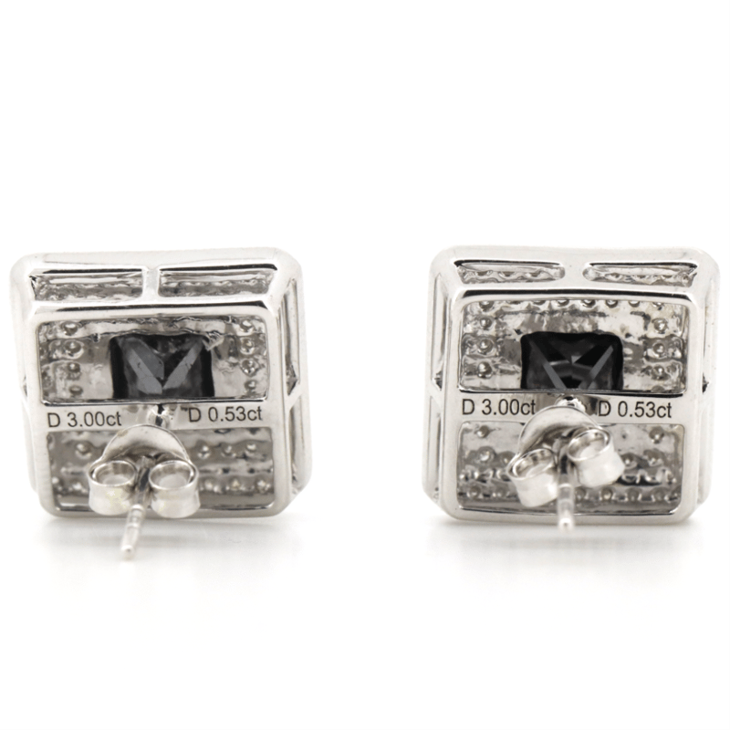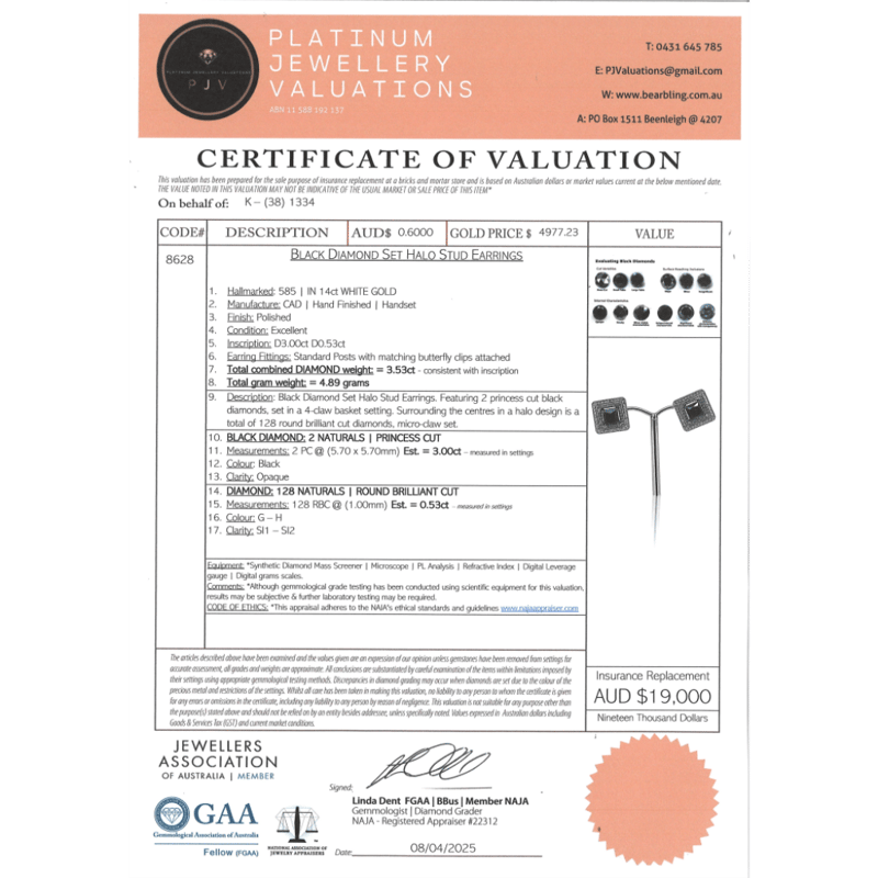 14K WHITE GOLD, BLACK DIAMOND AND DIAMOND, HALO STUD EARRINGS. The Earrings Feature, 2 Princess Cut, Black Diamonds (3.00Ct Tdw, Opaque), 4 Claw Set. Encompassing The Centre In A Halo Are, 128 Round Brilliant Cut, Diamonds (0.53Ct Tdw, G-H Colour, Si1-Si2), Micro-Claw Set. The Earrings Feature, Butterfly Post Backs. Valuations Provided by an Independent Third-Party Professional Not Directly Associated With Lloyds Auctions at AUD $$19,000.00This valuation has been conducted by an independent third-party professional. The valuation amount is an assessment by the issuing valuer and does not reflect the auction value of the item. Any inquiries regarding the valuation should be directed to the issuing valuer (refer to contact details on the certificate), as Lloyds Auctions has no affiliation or influence over the valuation, the valuer, or the stated amount. Condition: Good - Refer Images 0645844+5044