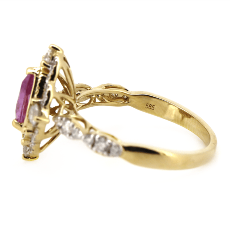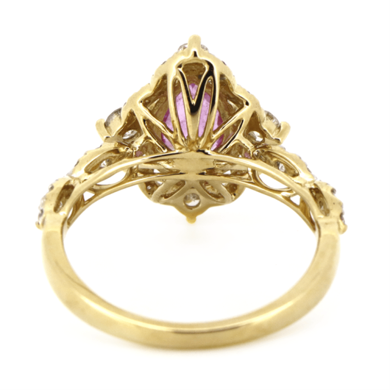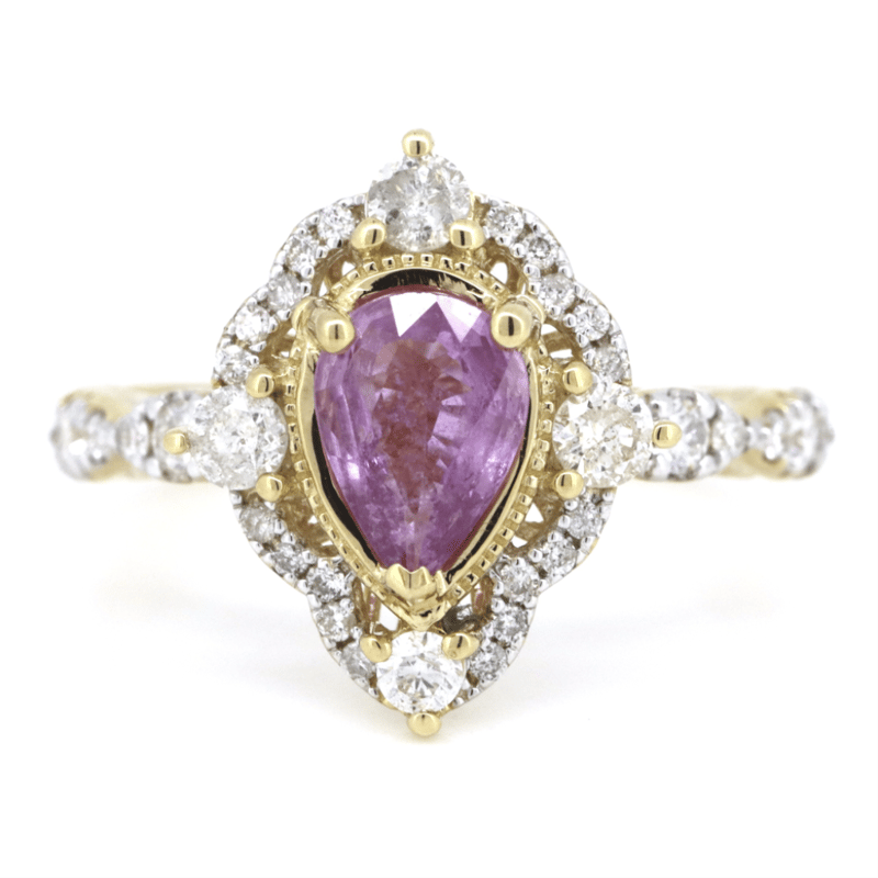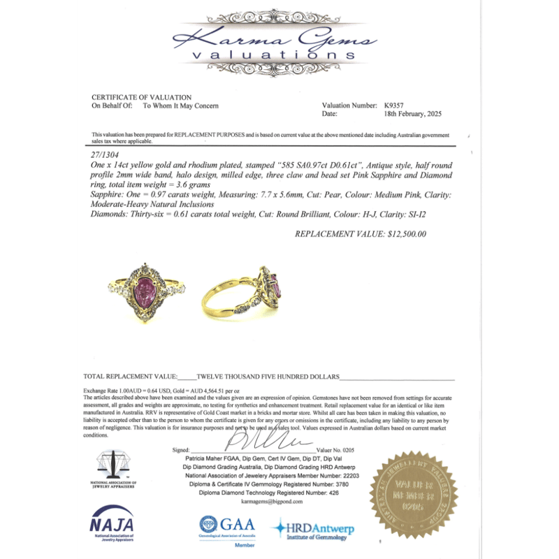 14K YELLOW GOLD, PINK SAPPHIRE AND DIAMOND, ANTIQUE INSPIRED RING. The Centre Features, One Pear Cut, Medium Pink, Sapphire (0.97Ct, Moderate-Heavy Natural Inclusions), 3 Claw Set. Encompassing The Centre And Decorating Band Are, 36 Round Brilliant Cut, Diamonds (0.61Ct Tdw, H-J Colour, Si-I2 Clarity), Claw Set. Ring Size N. Valuations Provided by an Independent Third-Party Professional Not Directly Associated With Lloyds Auctions at AUD $$12,500.00This valuation has been conducted by an independent third-party professional. The valuation amount is an assessment by the issuing valuer and does not reflect the auction value of the item. Any inquiries regarding the valuation should be directed to the issuing valuer (refer to contact details on the certificate), as Lloyds Auctions has no affiliation or influence over the valuation, the valuer, or the stated amount. Condition: Good - Refer Images 0645847+86