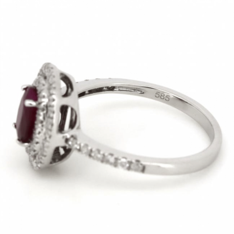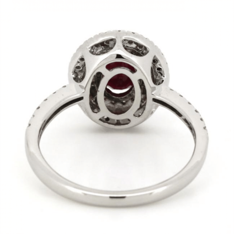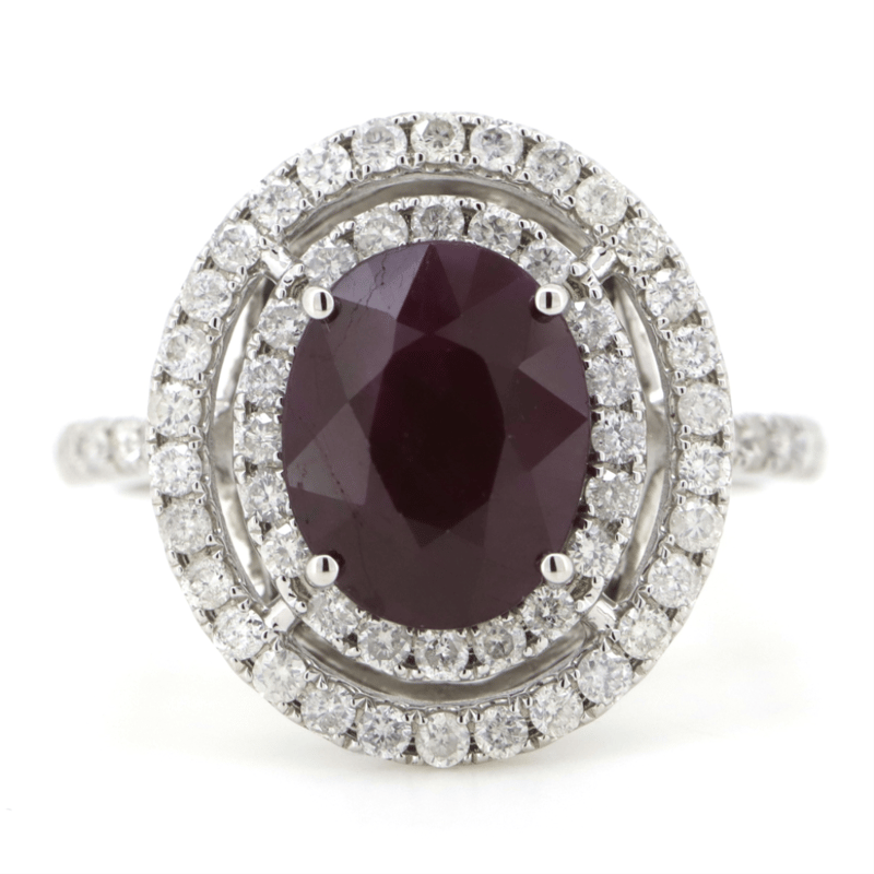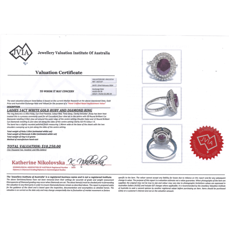 14K WHITE GOLD, RUBY AND DIAMOND, DOUBLE HALO RING. The Centre Features, One Oval Faceted Cut, Deep Red, Ruby (2.95Ct, Included, Heat Enhanced), 4 Claw Set. Surrounding The Centre In A Double Halo And Decorating The Band Are, 62 Round Brilliant Cut, Diamonds (0.68Ct Tdw, I-K Colour, Si2-P2 Clarity), Claw Set. Ring Size M. Valuations Provided by an Independent Third-Party Professional Not Directly Associated With Lloyds Auctions at AUD $$10,250.00This valuation has been conducted by an independent third-party professional. The valuation amount is an assessment by the issuing valuer and does not reflect the auction value of the item. Any inquiries regarding the valuation should be directed to the issuing valuer (refer to contact details on the certificate), as Lloyds Auctions has no affiliation or influence over the valuation, the valuer, or the stated amount. Condition: Good - Refer Images 0645847+7