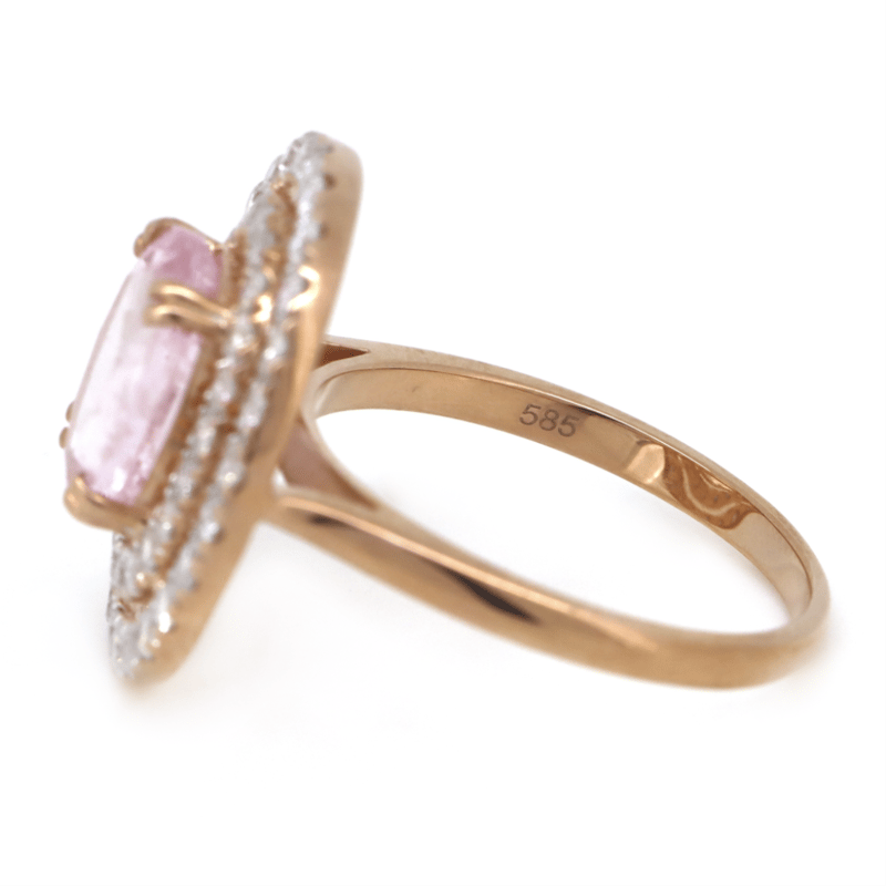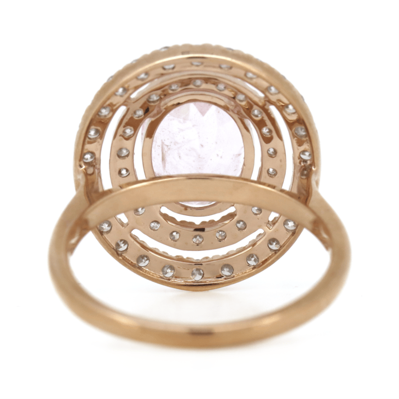 14K ROSE GOLD, MORGANITE AND DIAMOND, DOUBLE HALO RING. The Design Features, One, Oval Cut, Moderate Light Pink, Morganite (2.80Ct, Slightly Included), Double 4 Claw Set Basket Setting. Encompassing The Design Are, 49 Round Brilliant Cut, Diamonds (1.02Ct Tdw, H-I Colour, Si2-P1 Clarity), Bead Set. Ring Size P. Valuations Provided by an Independent Third-Party Professional Not Directly Associated With Lloyds Auctions at AUD $$10,000.00This valuation has been conducted by an independent third-party professional. The valuation amount is an assessment by the issuing valuer and does not reflect the auction value of the item. Any inquiries regarding the valuation should be directed to the issuing valuer (refer to contact details on the certificate), as Lloyds Auctions has no affiliation or influence over the valuation, the valuer, or the stated amount. Condition: Good - Refer Images 0645847+41