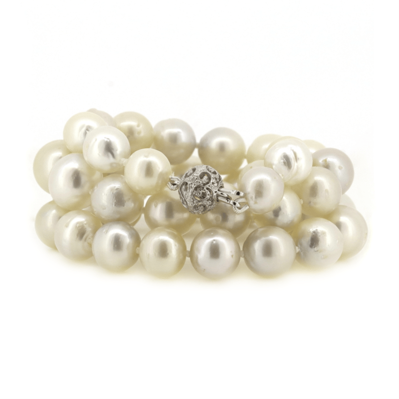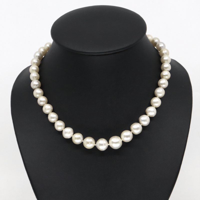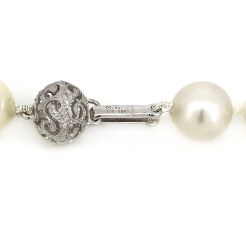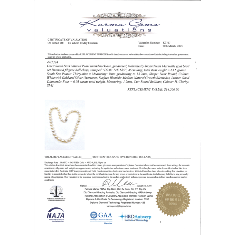 14K WHITE GOLD, WHITE CULTURED SOUTH SEA PEARL AND DIAMOND, STRAND NECKLACE. The Design Features, 39 Near Round, White With Gold And Silver Overtones, Cultured South Sea Pearls (13.20Mm Size, Good Lustre, Natural Blemishes). Embellishing The 14K White Gold Filigree Ball Clasp Are, 4 Round Brilliant Cut, Diamonds (0.03Ct Tdw, H Colour, Si-I1 Clarity), Bead Set. Necklace Length Is 45Cm. Valuations Provided by an Independent Third-Party Professional Not Directly Associated With Lloyds Auctions at AUD $$14,500.00This valuation has been conducted by an independent third-party professional. The valuation amount is an assessment by the issuing valuer and does not reflect the auction value of the item. Any inquiries regarding the valuation should be directed to the issuing valuer (refer to contact details on the certificate), as Lloyds Auctions has no affiliation or influence over the valuation, the valuer, or the stated amount. Condition: Good - Refer Images 0645847+54