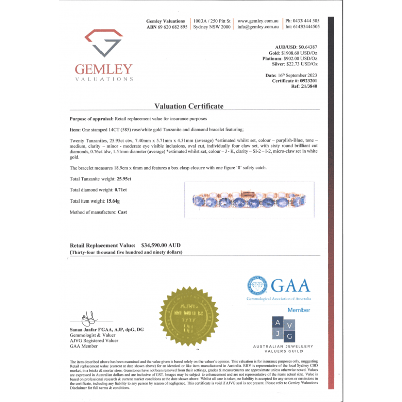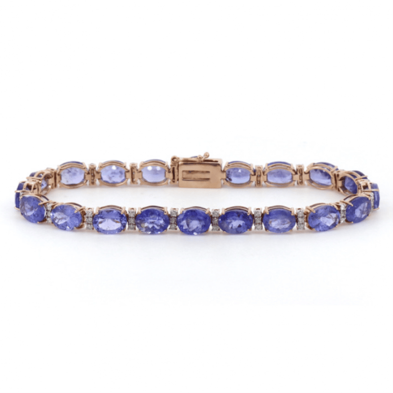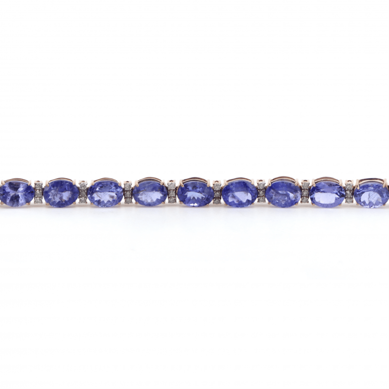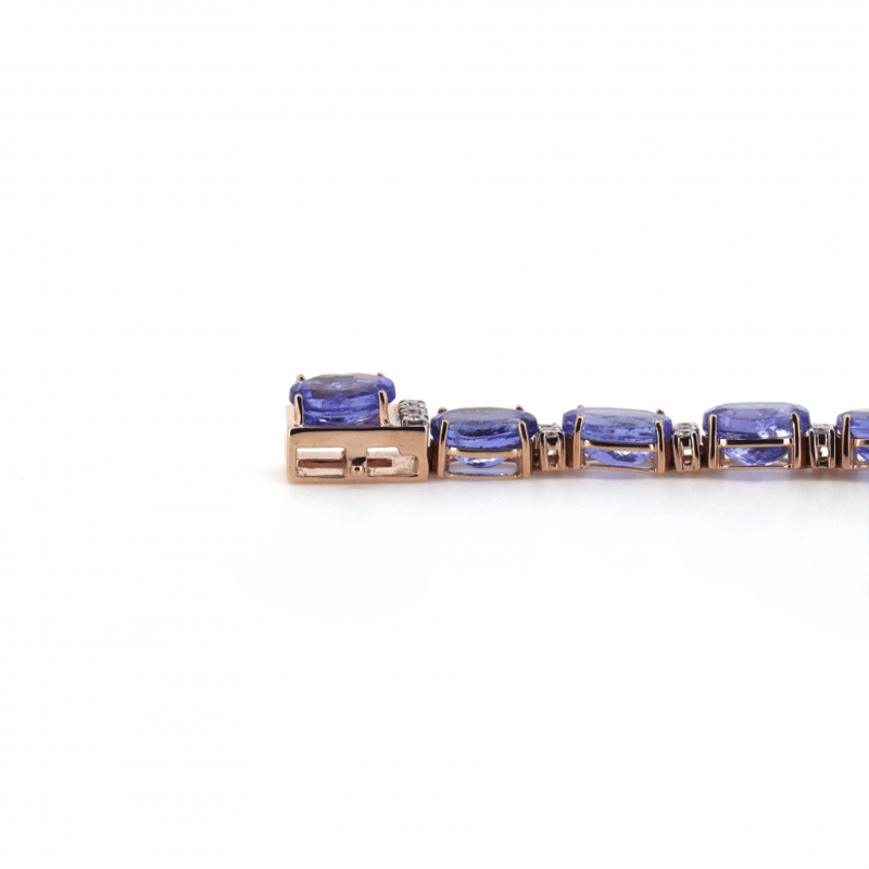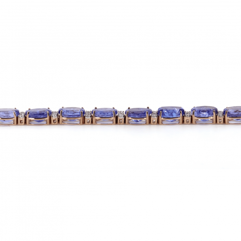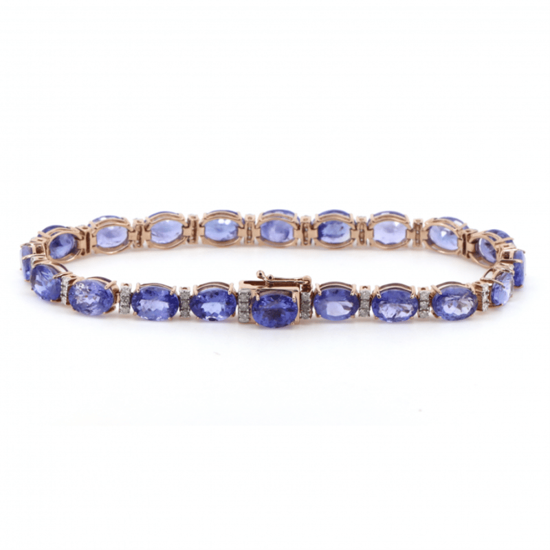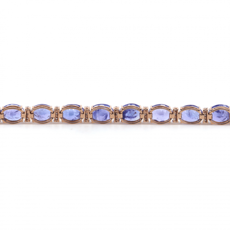 14K ROSE GOLD, TANZANITE AND DIAMOND, LINE BRACELET. The Bracelet Features, 20 Oval Cut, Medium Purplish-Blue, Tanzanites (25.95Ct Tsw, Moderate Eye Visible Inclusions), 4 Claw Set. Alternating Between Are, 60 Round Brilliant Cut, Diamonds (0.71Ct Tdw, J-K Colour, Si2-I2 Clarity), Micro-Claw Set In White Gold. The Bracelet Has A Box Lock Closure With A Figure Eight Safety Latch. Bracelet Length Is 18.9Cm. Valuations Provided by an Independent Third-Party Professional Not Directly Associated With Lloyds Auctions at AUD $$34,590.00This valuation has been conducted by an independent third-party professional. The valuation amount is an assessment by the issuing valuer and does not reflect the auction value of the item. Any inquiries regarding the valuation should be directed to the issuing valuer (refer to contact details on the certificate), as Lloyds Auctions has no affiliation or influence over the valuation, the valuer, or the stated amount. Condition: Good - Refer Images 0645847+38