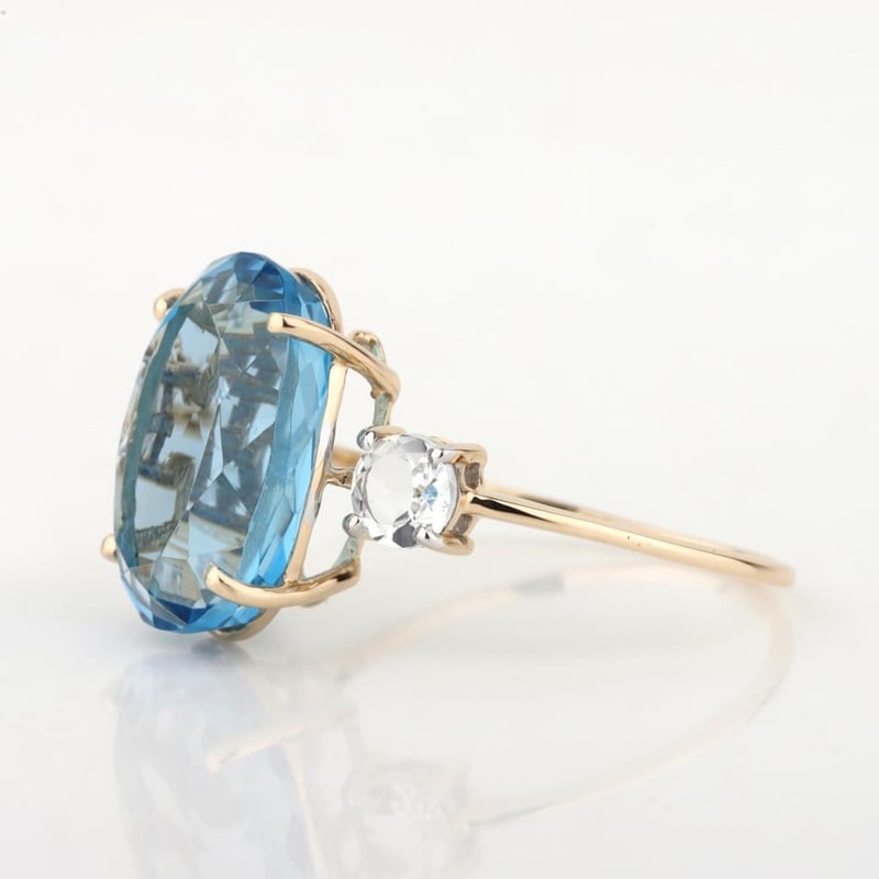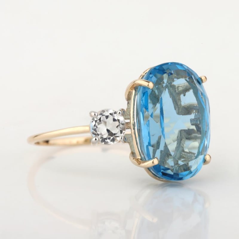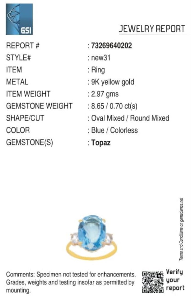 9CT YELLOW GOLD NATURAL SWISS BLUE TOPAZ RING Weight Of The Item: 2.97 GFineness Of Metal(S): Yellow Gold 9KtThe Ring Consists Of (1) Oval Brilliant Natural Swiss Blue Topaz & (2) Round Brilliant Cut White Topaz.Identification: Natural Swiss Blue Topaz / Natural White TopazColor: Blue / WhiteShape: Oval Brilliant Cut / Round Faceted CutNo. Of Stone: 3Dimension: 14 Mm X 10 Mm X 8.4 MmWeight: 8.65 Carats / 0.7 CaratsCut: Very Good. Certificates Are Provided By Gemological Science International (Gsi), An Independent Third-Party Gemological Laboratory Based In The Usa And Recognised Among The Top 10 Gem Labs Globally Markings: 9ct Condition: Good - Refer Images 0488218+41