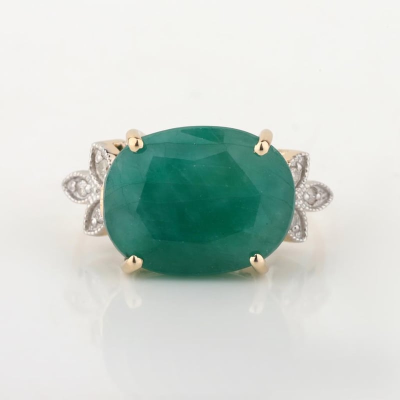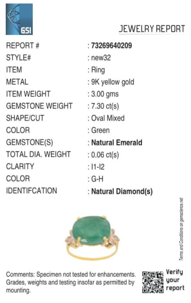 9CT YELLOW GOLD NATURAL EMERALD & DIAMOND RING Weight Of The Item: 3 GFineness Of Metal(S): Yellow Gold 9KtThe Ring Consists Of (1) Oval Brilliant Natural Emerald. Surrounding The Main Stones Are Round Brilliant Cut Natural Diamonds.Identification: Natural EmeraldColor: GreenShape: Oval Brilliant CutNo. Of Stone: 1Dimension: 14 Mm X 10 Mm X 8.4 MmWeight: 7.3 CaratsCut: Very GoodIdentification: Natural DiamondShape: Round Brilliant CutWeight: 0.06 CtsCut: Excellent.Certificates Are Provided By Gemological Science International (Gsi), An Independent Third-Party Gemological Laboratory Based In The Usa And Recognised Among The Top 10 Gem Labs Globally Markings: 9ct Condition: Good - Refer Images 0488218+44