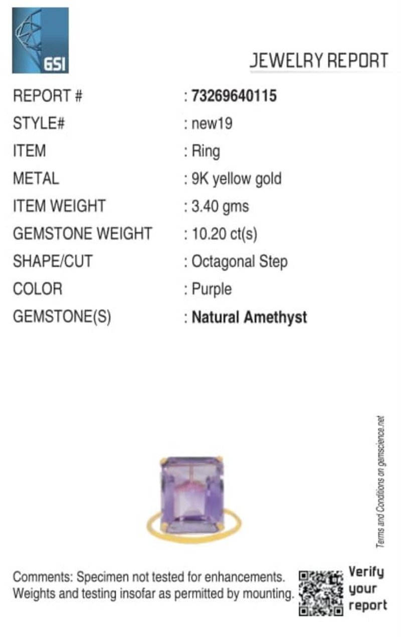 9CT YELLOW GOLD NATURAL AMETHYST RING Weight Of The Item: 3.4 GFineness Of Metal(S): Yellow Gold 9KtThe Ring Consists Of (1) Octagon Brilliant Natural Amethyst.Identification: Natural AmethystColor: PurpleShape: Octagon Brilliant CutNo. Of Stone: 1Dimension: 15 Mm X 12 Mm X 9 MmWeight: 10.2 CaratsCut: Very Good. Certificates Are Provided By Gemological Science International (Gsi), An Independent Third-Party Gemological Laboratory Based In The Usa And Recognised Among The Top 10 Gem Labs Globally Markings: 9ct Condition: Good - Refer Images 0488218+20