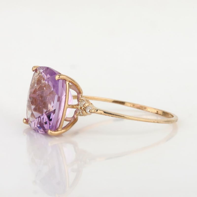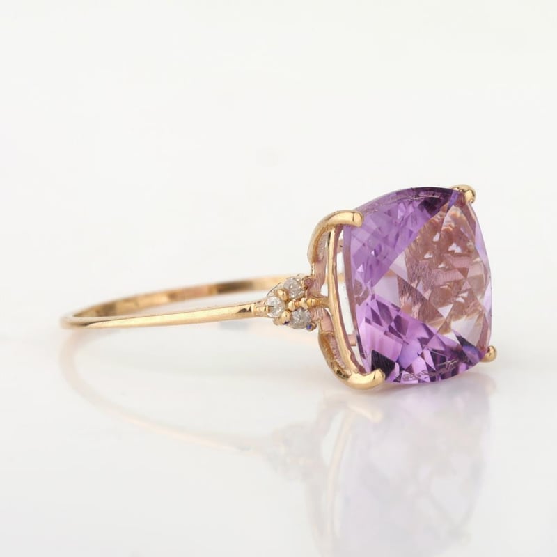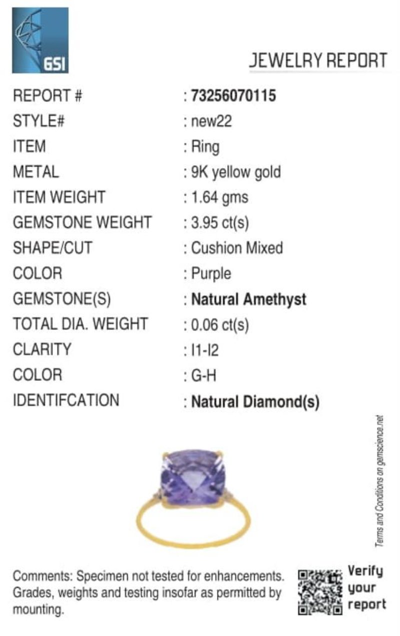 9CT YELLOW GOLD NATURAL AMETHYST & DIAMOND RING Weight Of The Item: 1.64 GFineness Of Metal(S): Yellow Gold 9KtThe Ring Consists Of (1) Cushion Brilliant Natural Amethyst. Surrounding The Main Stones Are Round Brilliant Cut Natural Diamonds.Identification: Natural AmethystColor: PurpleShape: Cushion Brilliant CutNo. Of Stone: 1Dimension: 10 Mm X 10 Mm X 6 MmWeight: 3.95 CaratsCut: Very GoodIdentification: Natural DiamondShape: Round Brilliant CutWeight: 0.06 CtsCut: Excellent.Certificates Are Provided By Gemological Science International (Gsi), An Independent Third-Party Gemological Laboratory Based In The Usa And Recognised Among The Top 10 Gem Labs Globally Markings: 9ct Condition: Good - Refer Images 0488218+24