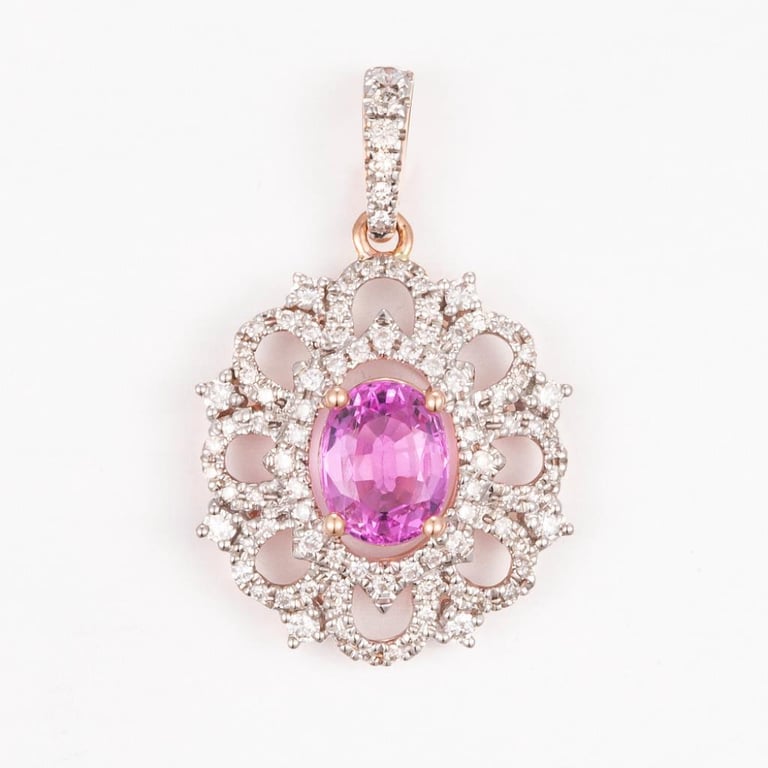 14CT ROSE GOLD PINK SAPPHIRE AND DIAMOND CLUSTER PENDANT FEATURING CENTRE, ONE OVAL CUT, FANCY VIVID PURPLISH PINK SAPPHIRE (0.96CT, SLIGHTLY INCLUDED), CLAW SET, WITH 90 ROUND BRILLIANT CUT DIAMONDS (0.27CT TDW, G-H COLOUR, VS1-VS2 CLARITY), BEAD SET. Valuations Provided by an Independent Third-Party Professional Not Directly Associated With Lloyds Auctions at AUD $16000This valuation has been conducted by an independent third-party professional. The valuation amount is an assessment by the issuing valuer and does not reflect the auction value of the item. Any inquiries regarding the valuation should be directed to the issuing valuer (refer to contact details on the certificate), as Lloyds Auctions has no affiliation or influence over the valuation, the valuer, or the stated amount. 0+1296
