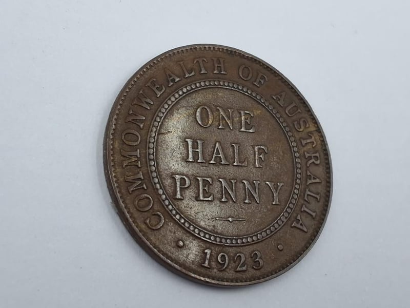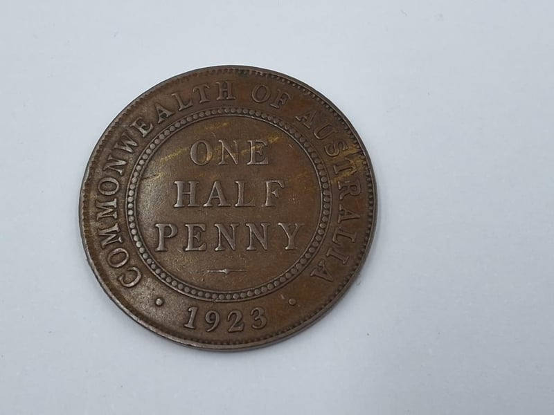 1923 : THE RAREST AUSTRALIAN HALLFPENNY - THIS 1923 HAS STRONG 6 PEARLS , FAINT 7TH , CLEAR FIELDS , NICE EVEN TAN PATINA & WOULD GRADE GVF WITH A C.V. $4,000. 782478+17