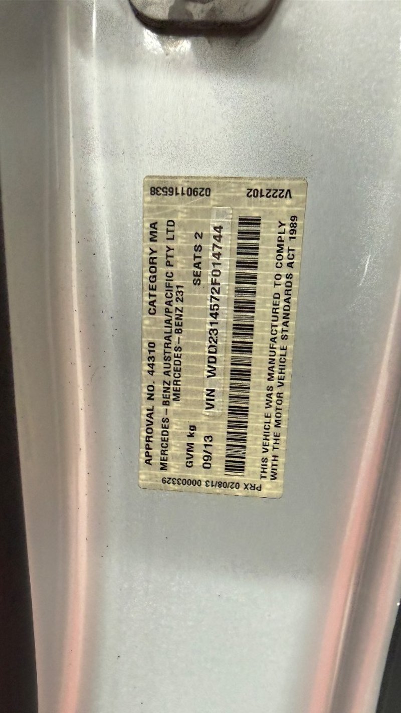 2013 Mercedes-Benz SL350 R231 SL350 BlueEFFICIENCY Year: 2013 Make: Mercedes-Benz Model: SL350 Series: R231 Badge: SL350 BlueEFFICIENCY Body: 2-Door Convertible Drive Type: Rear wheel drive Odometer: Indicating 127,165 Kilometres Engine: 3.5 V6 Petrol Transmission: Automatic Colour: Silver Seats: 2 Description/extras: Air Conditioning, Power windows, SRS, Sat Nav, Cruise control, Central locking. Carbon Fibre, Spoiler, Genuine SL63 Rims, AMG GTS Grille, Carbon Indy In steering Wheel. Price Guide - $45,000 - $52,350 (Based on Unmodified Vehicle) VIN: WDD2314572F014744 ENG No: 27695430342831 (as per PPSR) (Key #A29 Carrara x2 keys) Lloyds stock #587542+1 #PCV #FORTYPLUS