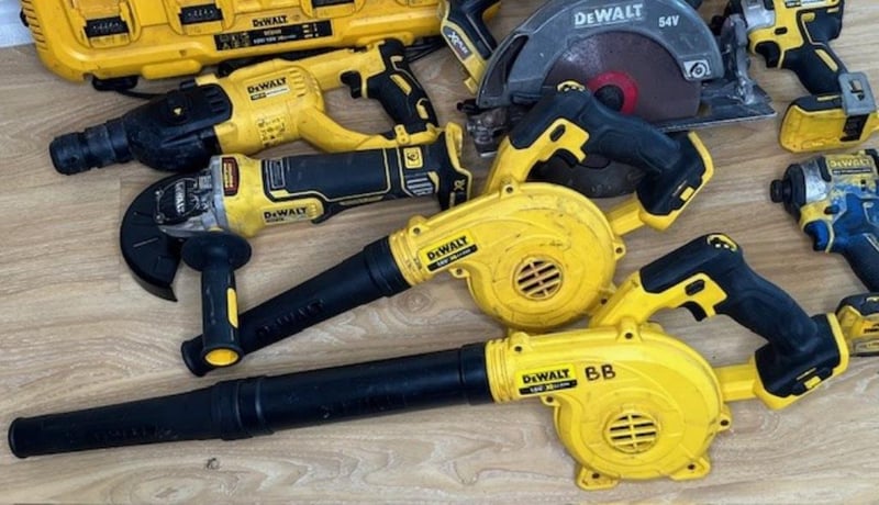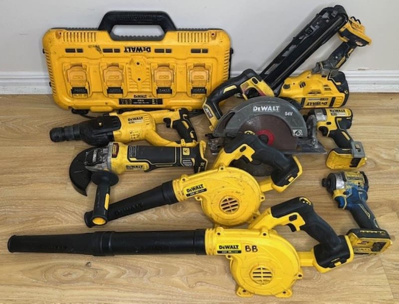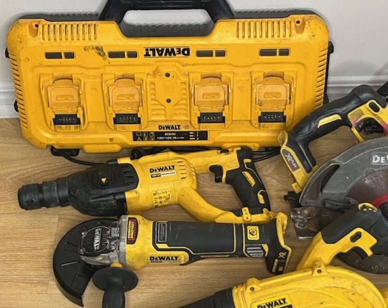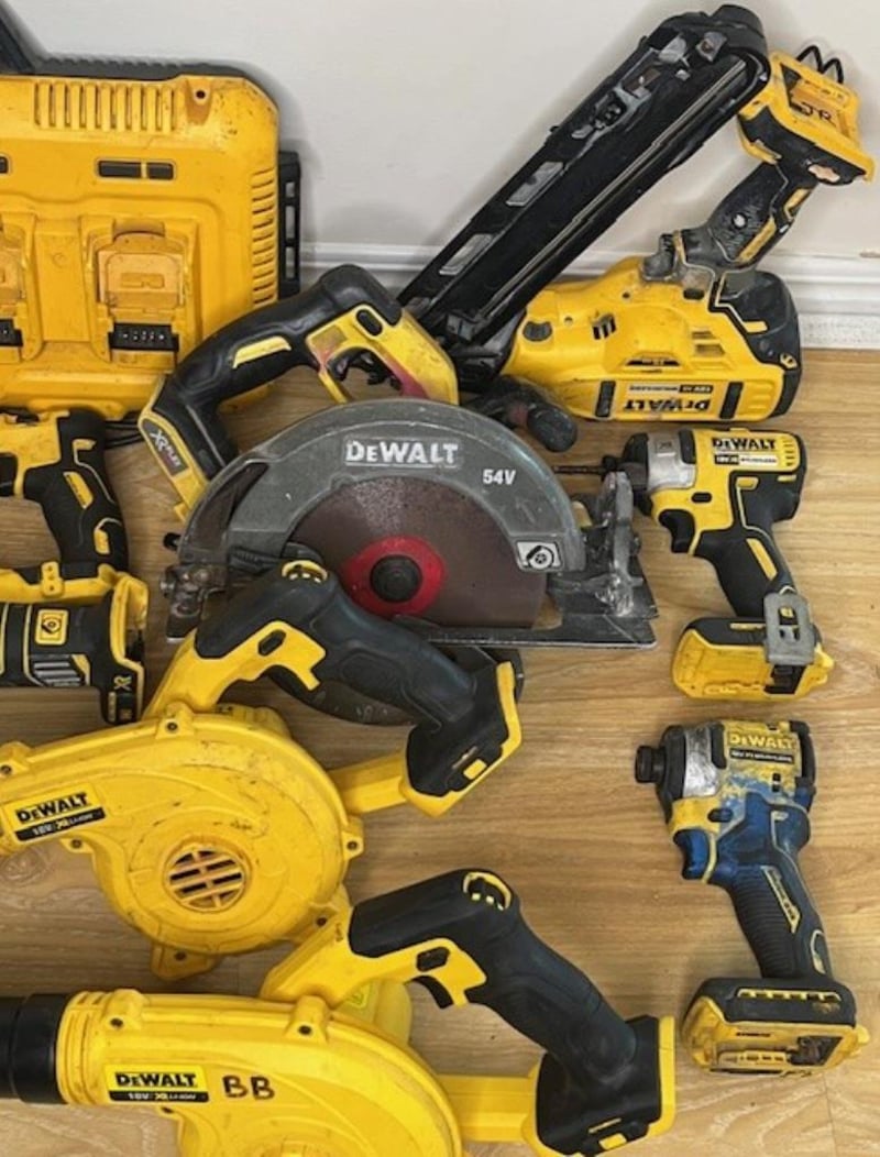 Cordless DeWalt 18V tools. 1 x DCN650 nailer, 2 x DCV100-XE mini blowers, 1 x DCH133 rotary hammer drill, 1 x circular saw, 1 x DCF850 impact driver, 1 x DCF887-XE impact driver, 1 x DCG406 angle grinder, 1 x DCB104 4 port charger. Skins only, no batteries. Condition: Not working, untested, for parts or repair.