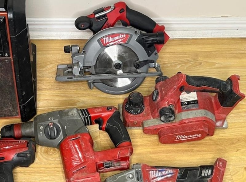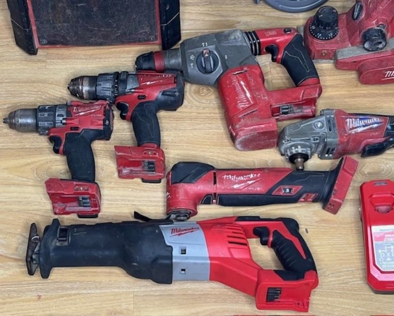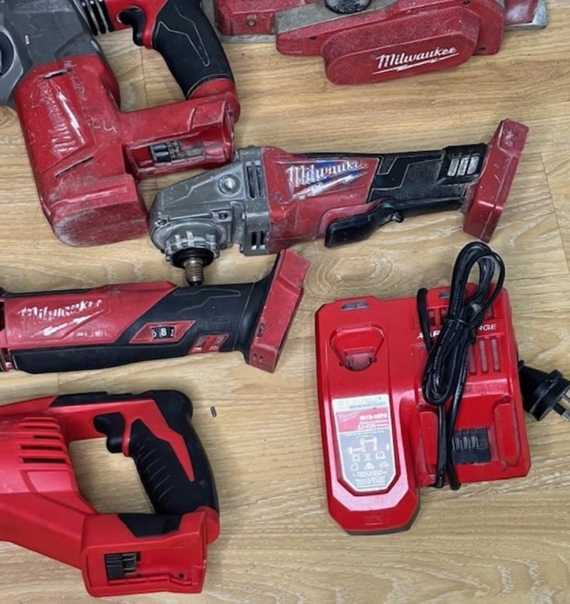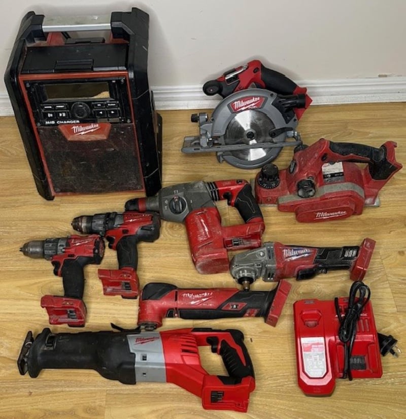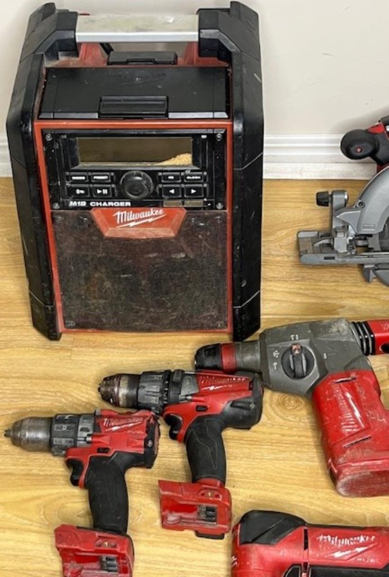 Cordless Milwaukee 18V tools. 1 x M18 circular saw, 1 x M18 reciprocating saw, 1 x M18 CHX rotary hammer drill, 2 x M18 hammer drills, 1 x M18 RC bluetooth radio, 1 x CAG125XPD angle grinder, 1 x M18 BP planer, 1 x M18 FMT multifunction tool, 1 x M12-18FC charger. Skins only, no batteries. Condition: Not working, untested, for parts or repair.