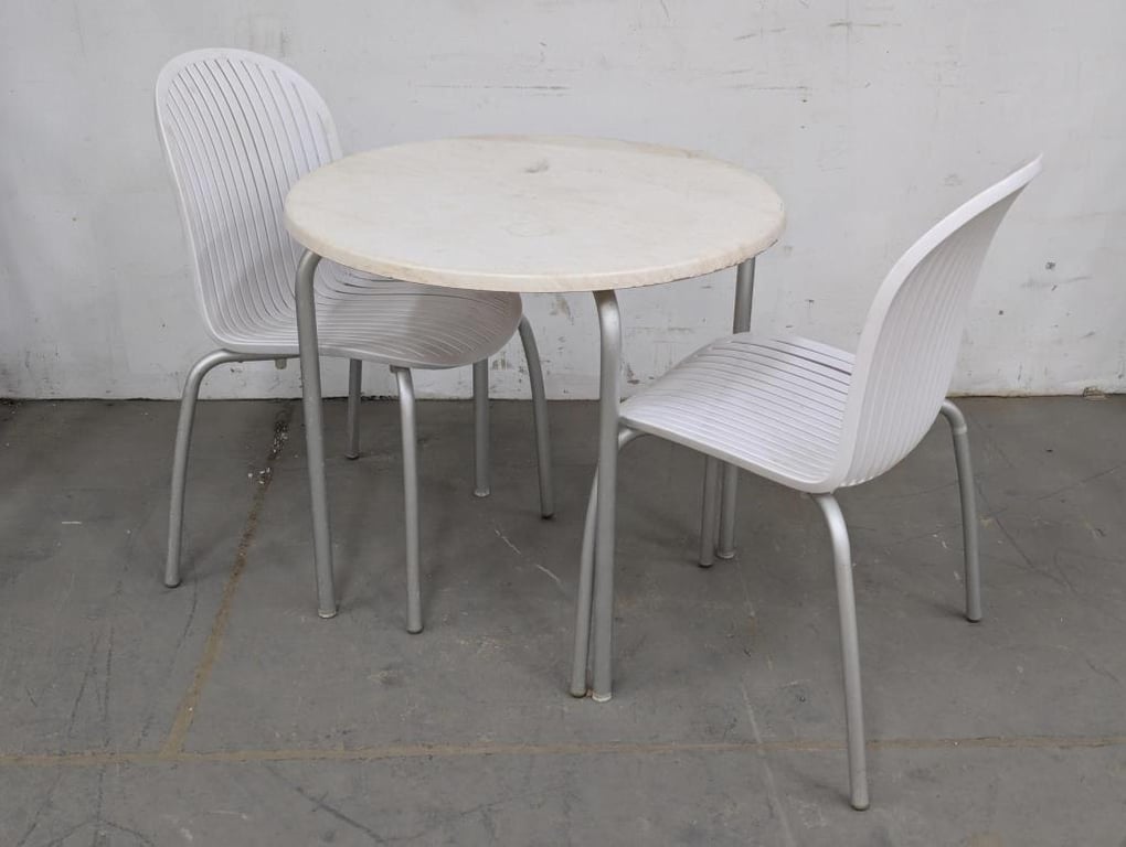 Outdoor Setting, Table and 2 Chairs Note: one chair has slight damage - refer to images Dimensions Table: H 72cm x W 80cm x D 80cm Dimensions Chairs: H 88cm x W 50cm x D 51cm SOLD AS LOT