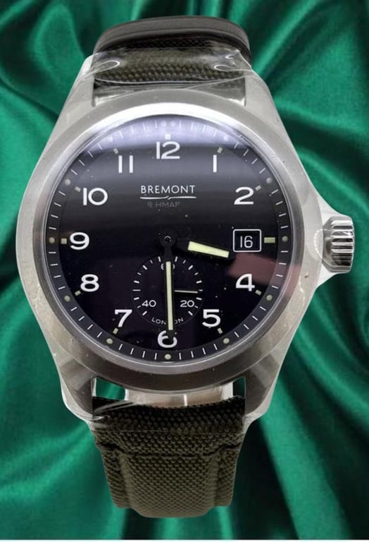 BREMONT BP BROADSWORD 2023 Price Guide - Circa $3,500 PRODUCTION YEAR: 2023 DIAL: BLACK CASE DESCRIPTION: STAINLESS STEEL CASE SIZE: 40MM BRACELET: KHAKI GREEN SAILCLOTH MOVEMENT: AUTOMATIC BOX: No Box Included PAPERS: No Papers Included Condition: Used - Refer Images Additional Information: Serial# 275*** SR